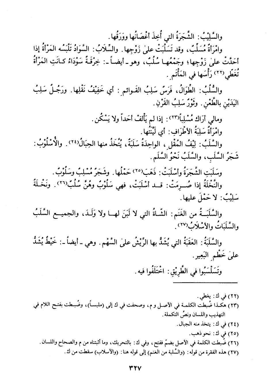 والسلِيْبُ : الشجَرَةُ التي أُخِذَ أغصَانُها ووَرَقُها . وامْرَأة مُسَلبٌ ، وقد تَسَلَّبَتْ على زَوْجِها . والسِّلاَبُ : السَّوَادُ تَلْبَسُه المَرْأةُ إذا أحَدتْ على زَوْجِها ؛ وجَمْعُها سُلُبٌ ، وهو - أيضاً - : خِرْقَةٌ سَوْدَاءُ كانَتِ المَرْأةُ تُغطي رَأْسَها في المَأتَمِ . والسلُبُ : الطوَالُ ، فَرَس سَلِبُ القَوائمِ : أي خَفِيْفُ نَقْلِها . ورَجُلٌ سَلِبُ اليَدَيْنِ بالطعْنِ . وثَوْرٌ سَلِبُ القَرْنِ . ومالي أرَاك مُسْلِباً : إذا لم يَألفْ أحَداً ولا يَسْكُن . وامْرَأة سَلِبَةُ الأطْرَافِ : أي لَينَتُها . والسلَبُ : لِيْفُ المُقْلِ ، الواحِدَةُ سَلَبَةٌ ، يُتَخَذُ منها الحِبَالُ . والأسْلُوْبُ : شَجَرُ السلَبِ ، والسلَبُ نَحْوُ السَّلَم . وسَلَبَتِ الشجَرَةُ وأسْلَبَتْ : ذَهَبَ حَمْلُها . وشَجَرٌ مُسْلِبٌ وسَلُوْبٌ . والنَّخْلَةُ إذا صُرِمَتْ : قد أسْلَبَتْ ، فهي سَلُوْبٌ وهُنَّ سُلُبٌ . ونَخْلَة سَلِيْب : لا حَمْلَ عليها . والسلَبَةُ من الغَنَم : الشاةُ التي لا لَبَنَ لها ولا وَلَدَ ، والجميع السَّلَبُ والسلَبَاتُ والأسْلاَبُ . والسلَبَةُ : العَقَبَةُ التي يُشَد بها الريْشُ على السهْم . وهي - أيضاً - : خَيْطٌ يُشَدُّ على خَطْمِ البَعِير . وتَسَلْسَبُوا في الطرِيْقِ : اخْتَلَفُوا فيه .