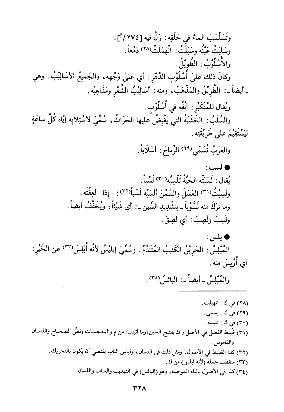وتَسَلْسَبَ الماءُ في حَلْقِه : زَل فيه . وسَلَبَتْ عَيْنُه وسَبَلَتْ : انْهَمَلَتْ دَمْعاً . والأسْلُوْبُ : الطوِيْلُ . وكانَ ذلك على أُسْلُوْبِ الدِّهْرِ : أي على وَجهِه ، والجَميعُ الأسَالِيْبُ . وهي - أيضاً - : الطرِيْقُ والمَذْهَبُ ، ومنه : أسَالِيْبُ الشِّعْرِ ومَذَاهِبُه . وُيقال للمُتَكَبرِ : أنْفُه في أُسْلُوْبِ . والسلْبُ : الخَشَبَةُ التي يَقْبِضَُ عليها الحَرّاثُ ، سُمِّيَ لاسْتِلابِه إياه كُلَّ ساعَةٍ ليَسْتَقِيْمَ على طَرِيْقَتِه . والعَرَبُ تُسَمّي الرماحَ : أسْلَاباً . لسب يُقال : لَسَبَتْه الحَيَّةُ تَلْسِبُه لَسْباً . ولَسِبْتُ العَسَلَ والسمْنَ ألْسَبُه لَسْباً : إذا لَعِقْتَه . وما تَرَكَ منه لَسوْباً - بتَشْدِيدِ السِّين - : أي شَيْئاً ، وُيخَفَفُ أيضاً . ولَسِبَ ولَصِبَ : أي لَصِقَ . بلس المُبْلِسُ : الحَزِيْنُ الكَئيبُ المُتَنَدِّمُ . وسُمِّيَ إبليْسُ لأنَّه أُبْلِسَ عن الخَيْرِ : أي أُوْيِس منه . والمُبْلِسُ - أيضاً - : البائسُ .