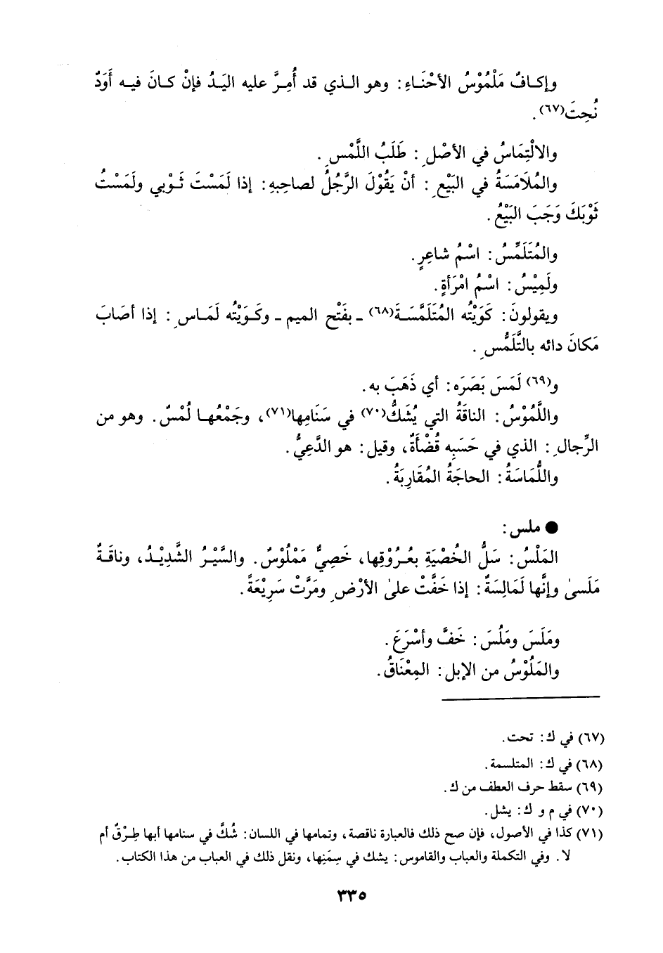 وإكافٌ مَلْمُوْسُ الأحْنَاءِ : وهو الذي قد أُمِرَّ عليه اليَدُ فإنْ كانَ فيه أَوَدٌ والالْتِمَاسُ في الأصْلِ : طَلَبُ اللَّمْسِ . والمُلَامَسَةُ في البَيْعِ : أنْ يَقُوْلَ الرَّجُلُ لصاحِبهِ : إذا لَمَسْتَ ثَوْبي ولَمَسْتُ ثَوْبَكَ وَجَبَ البَيْعُ . والمُتَلَفَسُ : اسْمُ شاعِرٍ . ولَمِيْسُ : اسْمُ امْرَأةٍ . ويقولونَ : كَوَيْتُه المُتَلَمَّسَةَ - بفَتْح الميم - وكَوَيْتُه لَمَاسِ : إذا أصَابَ مَكانَ دائه بالتَّلَمسِ . و لَمَسَ بَصَرَه : أي ذَهَبَ به . واللمُوْسُ : الناقَةُ التي يُشَك في سَنَامِها ، وجَمْعُها لُمْسٌ . وهو من الرجالِ : الذي في حَسَبِه قُضْاَةٌ ، وقيل : هو الدعِيُّ . واللُّمَاسَةُ : الحاجَةُ المُقَارِبَةُ . ملس المَلْسُ : سَلُ الخُصْيَةِ بعُرُوْقِها ، خَصي مَمْلُوْسٌ . والسَّيْرُ الشدِيْدُ ، وناقَةٌ مَلَسى وإنها لَمَالِسَةٌ : إذا خَفَّتْ على الأرْضِ ومَرتْ سَرِيْعَة . ومَلَسَ ومَلُسَ : خَفَّ وأسْرَعَ . والمَلُوْسُ من الإبل : المِعْنَاقُ .