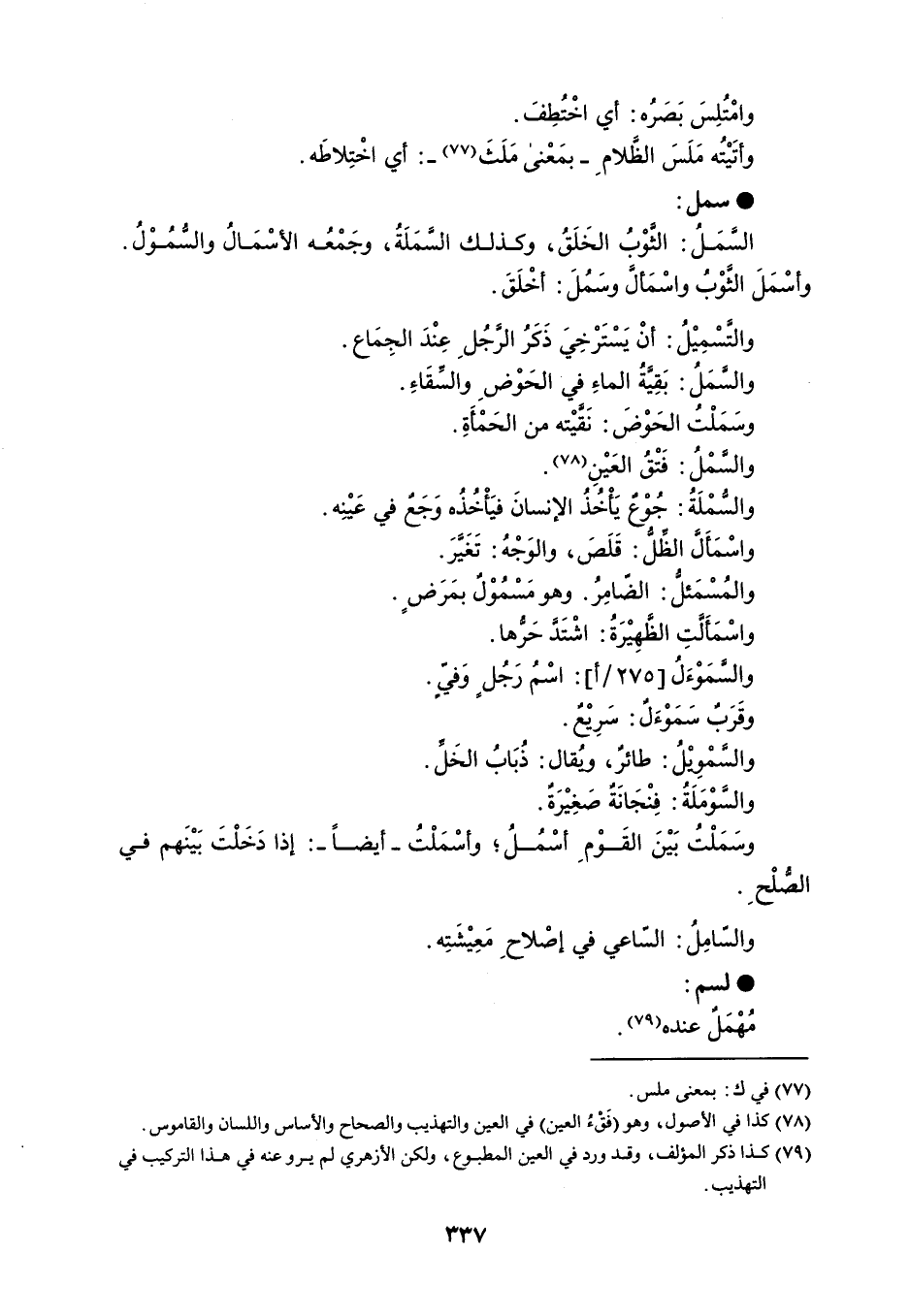 سمل السمَلُ : الثَّوْبُ الخَلَقُ ، وكذلك السمَلَةُ ، وجَمْعُه الأسْمَالُ والسُمُوْلُ . وأسْمَلَ الثوْبُ واسْمَال وسَمُلَ : أخْلَقَ . والتَسْمِيْلُ : أنْ يَسْتَرْخِيَ ذَكَرُ الرجُلِ عِنْدَ الجِمَاع . والسمَلُ : بَقِيةُ الماءِ في الحَوْضِ والسقَاءِ . وسَمَلْتُ الحَوْضَ : نَقَيْته من الحَمْاَةِ . والسمْلُ : فَتْقُ العَيْنِ . والسُمْلَةُ : جُوْعٌ يَأخُذُ الإنسانَ فيَأخُذُه وَجَعٌ في عَيْنِه . واسْمَأَل الظَلُ : قَلَصَ ، والوَجْهُ : تَغَيرَ . والمُسْمَئلُ : الضّامِرُ . وهو مَسْمُوْلٌ بمَرَضٍ . واسْمَألتِ الظهِيْرَةُ : اشْتَد حَرُها . والسمَوْءَلُ : اسْمُ رَجُل وَفيِّ . وقَرَبٌ سَمَوْءَلٌ : سَرِيْعٌ . والسَّمْوِيْلُ : طائر ، ويُقال : ذُبَابُ الخَل . والسوْمَلَةُ : فِنْجَانَةٌ صَغِيْرَة . وسَمَلْتُ بَيْنَ القَوْمِ أسْمُلُ ؛ وأسْمَلْتُ - أيضاً - : إذا دَخَلْتَ بَيْنَهم في الصلْحَ . والسامِلُ : السّاعي في إصْلاحِ مَعِيْشَتِه . لسم مُهْمَل عنده .