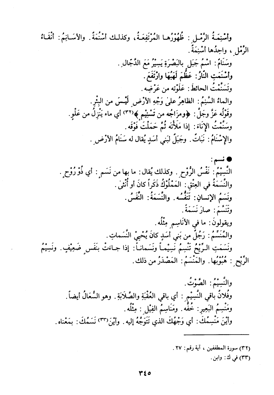 وأسنِمَةُ الرمْلِ : ظُهُوْرُها المُرْتَفِعَةُ ، وكذلك أسْنُمَةٌ . والأسَانِمُ : أنْقَاءُ الرمْلَ ، واحِدُها أسْنِمَةٌ . وسَنَامٌ : اسْمُ جَبَل بالبَصْرَةِ يَسِيْرُ مَعَ الدجالِ . وأسْنَمَتِ النارُ : عَظُمَ لَهَبُهَا وارتَفَعَ . وتَسَنمْت الحائطَ : عَلَوْته من عَرْضِه . والماءُ السنِمُ : الظاهِرُ على وَجْهِ الأرْضِ لَيْسرَ من البِئْرِ . وقَوْلُه عَزَوجَلً : ' ومزَاجُه من تَسْنِيْمٍ ' أي ماء يَنْزِلُ من عَلْوٍ . وسَنمْتُ الإنَاءَ : إذا مَلأتهَ ثُم حَمَلْتَ فَوْقَه . والإِسْنَامُ : نَبَات . وجَبَلٌ لبَني أسَدٍ يُقال له سَنَامُ الأرْضِ . نسم النَسِيْمُ : نَفْسُ الرُوْحِ . وكذلك يُقال : ما بها من نَسَمٍ : أي ذُوْ رُوْحٍ . والنسَمَةُ في العِتْقِ : المَمْلُوْكُ ذَكَراً كانَ أو أُنْثى . ونَسَمُ الإنسانِ : تَنَفسُه . والنسَمَة : النفَسُ . وتَنَسمَ : صارَ نَسَمَةً . ويقولونَ : ما في الأنَاسِمِ مِثْلُه . والمُنَسمُ : رَجُل من بَني أسَدٍ كانَ يُحْييْ النَسَماتِ . ونَسَمَتِ الريْحُ تَنْسِمُ نَسِيْماً ونَسَماناً : إذا جاءَتْ بنَفَسٍ ضَعِيْفٍ . ونَسِيْمُ الريْحِ : هُبُوْبُها . والمَنْسَمُ : المَصْدَرُ من ذلك . والنَسِيْمُ : الصوْتُ . وفُلانٌ باقي النَسِيْمِ : أي باقي العُقْبَةِ والصَّلَابَةِ . وهو السُّعَالُ أيضاً . ومَنْسِمُ البَعِيرِ : خُفُّه . ومَنَاسِمُ الفِيْلِ : مِثْلُه . وأيْنَ مَنْسِمُكَ : أي وَجْهُكَ الذي تَتَوَتجَهُ إليه . وأيْنَ نَسَمُكَ : بمَعْناه .