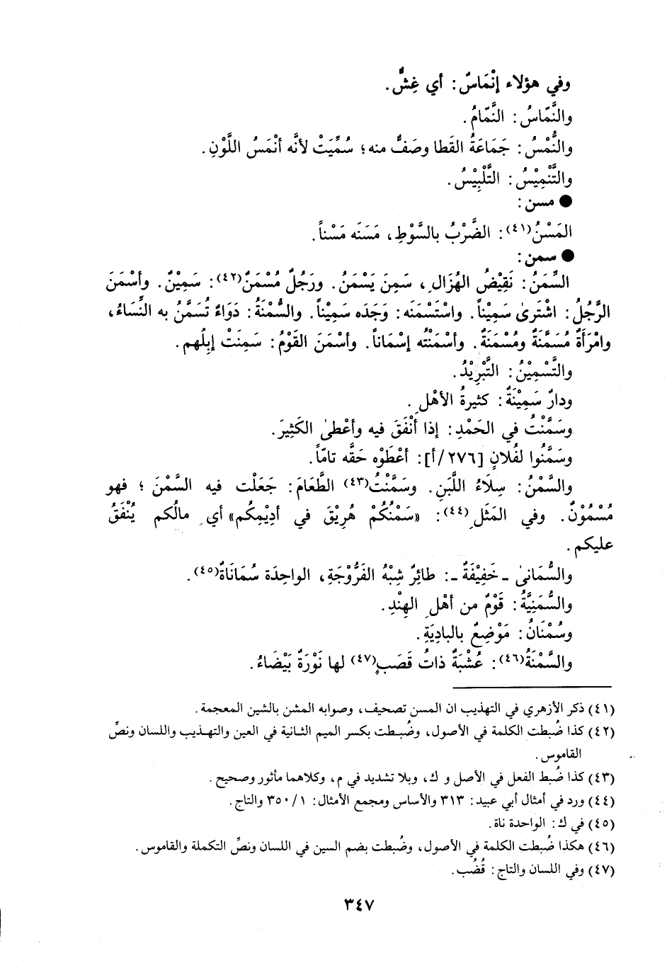 وفي هؤلاء انمَاسٌ : أي غِش . والنمّاسُ : النَّمّامُ . والنُّمْسُ : جَمَاعَةُ القَطا وصَفٌ منه ؛ سُمِّيَتْ لأنه أنْمَسُ اللَّوْنِ . والتنْمِيْسُ : التَّلْبِيْسُ . مسن المَسْنُ : الضَرْبُ بالسَّوْطِ ، مَسَنَه مَسْناً . سمن السمَنُ : نَقِيْضُ الهُزَالِ ، سَمِنَ يَسْمَنُ . ورَجُل مُسْمَنٌ : سَمِينٌ . وأسْمَنَ الرجلُ : اشْتَرى سَمِيْناً . واسْتَسْمَنَه : وَجَدَه سَمِيْناً . والسمْنَةُ : دَوَاء تُسَمَّنُ به النسَاءُ ، وامْرَأةٌ مُسَمنَةٌ ومُسْمَنَةٌ . وأسْمَنْتُه إسْمَاناً . وأسْمَنَ القَوْمُ : سَمِنَتْ إبِلهم . والتسْمِيْنُ : التَبْرِيْدُ . ودار سمِيْنَةٌ : كثيرةُ الأهْلِ . وسَمنْت في الحَمْدِ : إذا أنْفَقَ فيه وأعْطى الكَثِيرَ . وسَمنُوا لفُلانٍ : أعْطَوْه حَقَه تاماً . والسمْنُ : سِلَاءُ اللبَنِ . وسَمَّنْتُ الطَّعَامَ : جَعَلْت فيه السَّمْنَ ؛ فهو مُسْمُوْنٌ . وفي المَثَلِ : ' سَمْنُكُمْ هُرِيْقَ في أدِيْمِكُم ' أي مالُكم يُنْفَقُ عليكم . والسُمَانى - خَفِيْفَة - : طائِرٌ شِبْهُ الفَرُّوْجَةِ ، الواحِدَة سُمَانَاة . والسُّمَنِيَةُ : قَوْمٌ من أهْلِ الهِنْدِ . وسُمْنَانُ : مَوْضِعٌ بالبادِيَةِ . والسمْنَةُ : عُشْبَةٌ ذاتُ قَصَبٍ لها نَوْرَةٌ بَيْضَاء .