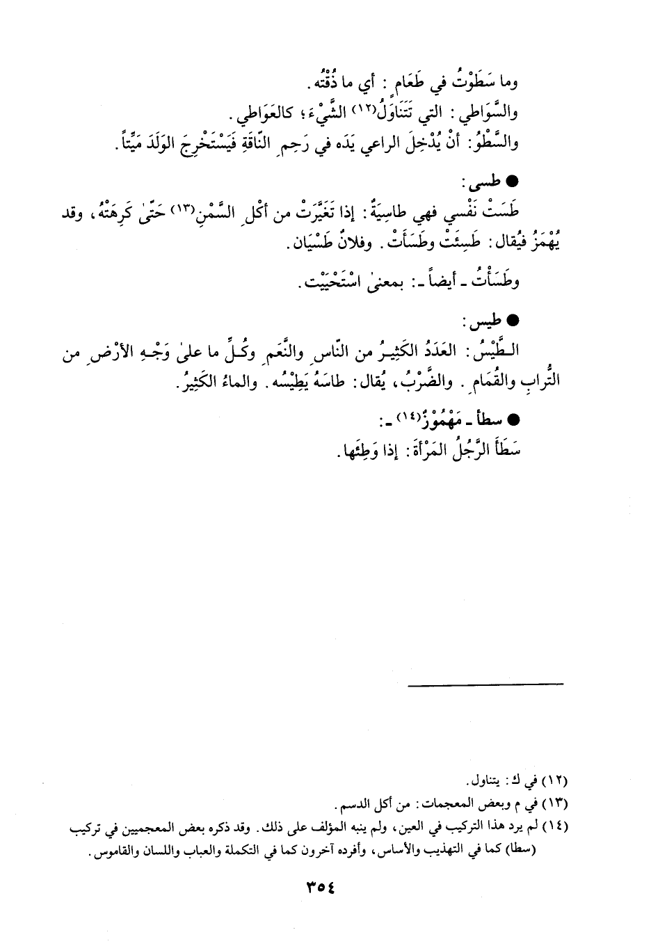 وما سَطَوْتُ في طَعَام : أي ماذُقْتُه . والسوَاطي : التي تَتَنَاولُ الشيْءَ ؛ كالعَوَاطي . والسَّطْو : أنْ يُدْخِلَ الراعي يَدَه في رَحِمِ النّاقَةِ فَيَسْتَخْرِجَ الوَلَدَ مَيِّتاً . طسىِ طَسَتْ نفسي فهي طاسِيَةٌ : إذا تَغَيَّرَتْ من أكْلِ السَّمْنِ حَتّى كَرِهَتْهُ ، وقد يُهْمَزُ فيُقال : طَسِئَتْ وطَسَأَتْ . وفلانٌ طَسْيَان . وطَسَأْتُ - أيضاً - : بمعنى اسْتَحْيَيْت . طيس الطيْسُ : العَدَدُ الكَثِيرُ من النّاسِ والنَعَمِ وكُلِّ ما على وَجهِ الأرْضِ من التُرابِ والقُمَامِ . والضَرْبُ ، يُقال : طاسَهُ يَطِيْسُه . والماءُ الكَثِيرُ . سطأ - مَهْمُوْزٌ - سَطَأَ الرجُلُ المَرْأةَ : إذا وَطِئَها .