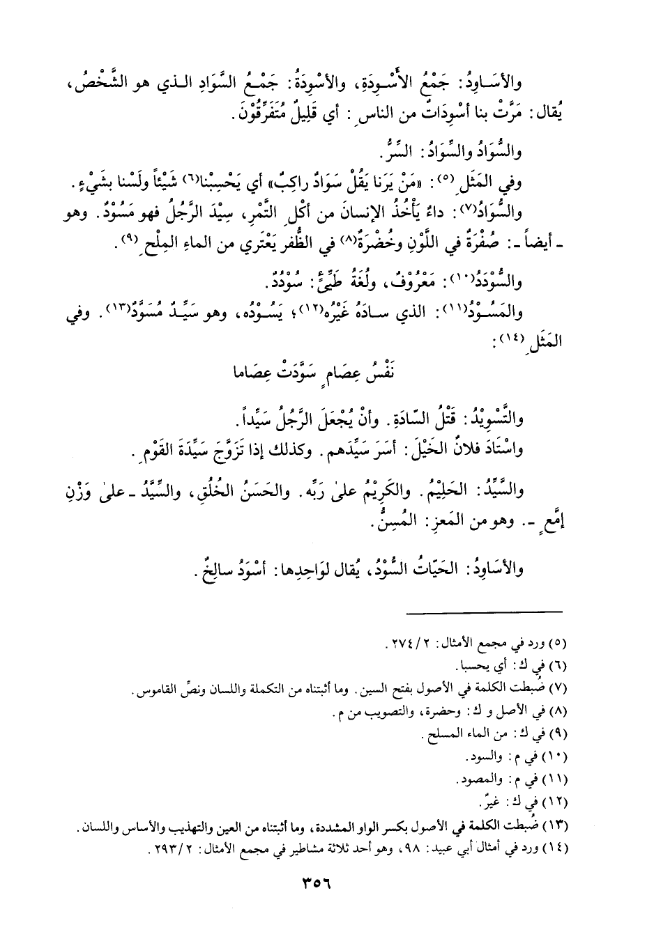 والأسَاوِدُ : جَمْع الأسوةِ ، والأسْوِدَةُ : جَمْعُ السَّوَادِ الذي هو الشَّخْصُ ، يُقال : مَرَّتْ بنا أسْوِدَاتٌ من الناسِ : أي قَلِيلٌ مُتَفَرِّقُوْنَ . والسُوَادُ والسوَادُ : السَرُّ . وفي المَثَلِ : ' مَنْ يَرَنا يَقُلْ سَوَادٌ راكِبٌ ' أي يَحْسِبْنا شَيْئاً ولَسْنا بشَيْءٍ . والسُوَادُ : داءٌ يَأْخُذُ الإنسانَ من أكْلِ التَّمْرِ ، سِيْدَ الرَّجُلُ فهو مَسُوْدٌ . وهو - أيضاً - : صُفْرَةٌ في اللوْنِ وخُضْرَةٌ في الظُفر يَعْتَري من الماءِ المِلْحِ . والسُوْدَدُ : مَعْرُوْفٌ ، ولغَةُ طَيئ : سُوْدُدٌ . والمَسُوْدُ : الذي سادَهُ غَيْرُه ؛ يَسُوْده ، وهو سَيِّدٌ مُسَوَّدٌ . وفي المَثَلَ : نَفْس عِصَامٍ سَوَّدَتْ عِصَاما والتَّسْوِيْدُ : قَتْلُ السّادَةِ . وأنْ يُجْعَلَ الرَّجلُ سَيِّداً . واسْتَادَ فلانٌ الخَيْلَ : أسَرَ سَيدَهم . وكذلك إذا تَزَوَّجَ سَيِّدَةَ القَوْمِ . والسيِّدُ : الحَلِيْمُ . والكَرِيْمُ على رَبِّه . والحَسَنُ الخُلُقِ ، والسِّيَّدُ - على وَزْنِ إمعٍ - . وهو من المَعزِ : المُسِنُّ . والأسَاوِدُ : الحَيّاتُ السُّوْدُ ، يُقال لوَاحِدِها : أسْوَدُ سالِخٌ .