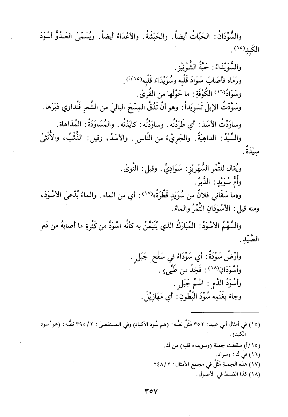 والسُّوْدَانُ : الحَيّاتُ أيضاً . والحَبَشَةُ . والأعْدَاءُ أيضاً . وُيسَمّى العَدُوُّ أسْوَدَ الكَبِدِ . والسُّوَيْدَاءُ : حَبَّةُ الشُوْنِيْز . ورَمَاه فأصَابَ سَوَادَ قَلْبِه وسُوَيْدَاءَ قَلْبِه . وسَوَادُ الكُوْفَةِ : ما حَوْلَها من القُرى . وسَوَّدْتُ الإبلَ تَسْوِيْداً : وهو أنْ تَدُقَ المِسْحَ الباليَ من الشَّعرِ فَتُداوي دَبَرَها . وساوَدْتُ الأسَدَ : أي طَرَدْتُه . وساوَدْتُه : كايَدْتُه . والمُسَاوَدَةُ : المُدَاهاة . والسيْدُ : الداهِيَةُ . والجَرِيْءُ من النّاسِ . والأسَدُ ، وقيل : الذِّئب ، والأنْثى سِيْدَةٌ . وُيقال للتَّمْرِ السهْرِيْزِ : سَوَادِيٌّ . وقيل : النَّوى . وأُمُّ سُوَيْدٍ : الدُّبرُ . و ' ما سَقَاني فلان من سُوَيْدٍ قَطْرَةً ' : أي من الماء . والماءُ يُدْعى الأسْوَدَ ، ومنه قيل : الأسْوَدَانِ التَّمْرُ والماءُ . والسهْمُ الأسْوَدُ : المُبَارَكُ الذي يُتَيَمَّنُ به كأنَّه اسْوَد من كَثْرةِ ما أصابَهُ من دَمِ الصيْدِ . وأرْضٌ سَوْدَة : أي سَوْدَاءُ في سَفْحِ جَبَلٍ . وأسْوَدَانِ : فَخِذٌ من طَيىءٍ . وأسْوَدُ الدمَ : اسْمُ جَبَل . وجاءَ بغَنَمِه سُوْدَ البُطُونِ : أي مَهَازِيْلَ .