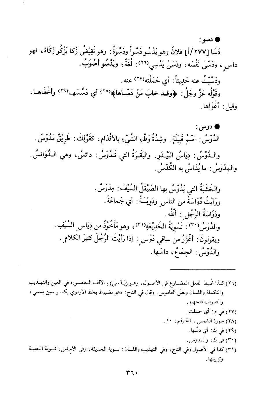دسو دَسَا فلانٌ وهو يَدْسُو دَسْواً ودَسْوة : وهو نَقِيْضُ زَكا يَزْكُو زَكَاء ، فهو داسٍ ، ودَسّى نَفْسَه ، ودَسَى يَدْسِي : لُغَة ؛ ويَدْسُو أصْوَبُ . ودَسَّيْتُ عنه حَدِيثاً : أي حَمَلْته عنه . وقَوْلُه عَزَ وجَل : ' وقد خابَ مَنْ دَسّاها ' أي دَسسَها وأخْفَاها ، وقيل : أغْوَاها . دوس الدوْسُ : اسْمُ قَبِيْلَةٍ . وشِدةُ وَطْءِ الشيْءِ بالأقْدَام ، كقَوْلِكَ : طَرِيْق مَدُوْسٌ . والدَّوْسُ : دِيَاسُ البَيْدَرِ . والبَقَرَةُ التي تَدُوْسُ : دائسٌ ، وهي الدَّوَائسُ . والمِدْوَسُ : ما يُدَاسُ به الكُدْسُ . والخَشَبَةُ التي يَدُوْسُ بها الصَّيْقَلُ السيْفَ : مِدْوَسٌ . ورَأيْتُ دُوَاسَةً من الناسِ ودَويسَةً : أي جَماعَةً . ودَواسَةُ الرجُلِ : أنْفُه . والدوْسُ : تَسْوِيَةُ الخَدِيْعَةِ ، وهو مَأْخُوْذٌ من دِيَاسِ السيْفِ . ويقولونَ : أغْزَرُ من ساقي دَوْسٍ : إذا رَأيْتَ الرَّجُلَ كثيرَ الكلامِ . والدَّوْسُ : الجِمَاعُ ، داسَها .