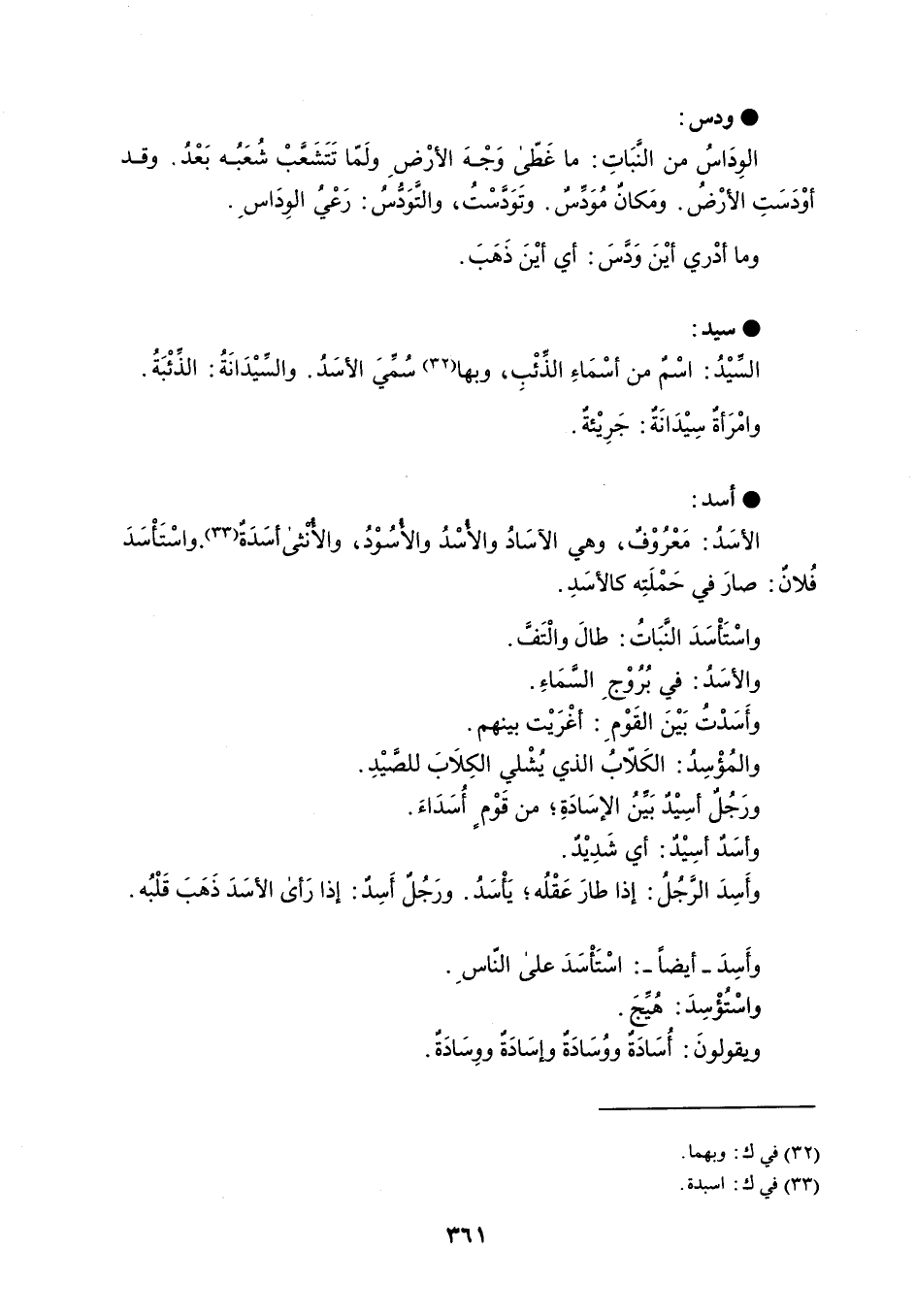 ودس الوِدَاسُ من النَّبَاتِ : ما غَطّى وَجهَ الأرْضِ ولَمّا تَتَشَعَّبْ شُعَبه بَعْدُ . وقد أوْدَستَ الأرْضُ . ومَكانٌ مُوَدِّسٌ . وتَوَدَّست ، والتَّوَدُّسُ : رَعْيُ الوِدَاسِ . وما أدْري أيْنَ وَدَّسَ : أي أيْنَ ذَهَبَ . سيد السيْدُ : اسْمٌ من أسْمَاءِ الذِّئْبِ ، وبها سُميَ الأسَدُ . والسِّيْدَانَةُ : الذِّئْبَةُ . وامْرَأةٌ سِيدَانَةٌ : جَرِيْئةٌ . أسد الأسَدُ : مَعْرُوْفٌ ، وهي الآسَادُ والأسْدُ والأسُوْدُ ، والانثى أسَدَة . واسْتَأْسَدَ فُلانٌ : صارَ في حَمْلَتِه كالأسَدِ . واسْتَاْسَدَ النَّبَاتُ : طالَ والْتَفَّ . والأسَدُ : في بُرُوْجِ السَّمَاءِ . وأَسَدْتُ بَيْنَ القَوْمِ : أغْرَيْت بينهم . والمُؤْسِدُ : الكَلّابُ الذي يُشْلي الكِلَابَ للصَّيْدِ . ورَجُلٌ أسِيْد بَيِّنُ الإسَادَةِ ؛ من قَوْمٍ أُسَدَاءَ . وأسَدٌ أسِيْدٌ : أي شَدِيْدٌ . وأَسِدَ الرَّجُلُ : إذا طارَ عَقْلُه ؛ يَأسَدُ . ورَجُلٌ أَسِدٌ : إذا رَأى الأسَدَ ذَهَبَ قَلْبُه . وأَسِدَ - أيضاً - : اسْتَأْسَدَ على الناسِ . واسْتُؤْسِدَ : هُيِّجَ . ويقولونَ : أُسَادَةٌ ووُسَادَةٌ وإسَادَة ووِسَادَةٌ .