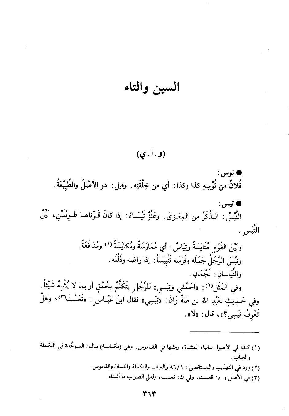 توس فُلان من تُوْسِهِ كذا وكذا : أي من خلْقَتِه . وقيل : هو الأصْلُ والطبِيْعَةُ . تيس التَيْسُ : الذَّكَرُ من المِعْزى . وعَنْز تَيْسَاءُ : إذا كانَ قَرْناها طَوِيْلَيْنِ ، بَيِّنُ التَيَس . وبَيْنَ القَوْمِ مُتَايَسَةٌ وتيَاس : أي ممَارَسَة ومُكايَسَةٌ ومُدافَعَةٌ . وتَيسَ الرجُلُ جَمَلَه وفَرَسَه تَتْيِيْساً : إذا راضَه وذَلَّلَه . والتيَاسانِ : نَجْمَانِ . وفي المَثَل : ' احْمُقي وتيْسي ' للرجُلِ يَتَكَلَّمُ بحُمْقٍ أو بما لا يُشْبِهُ شَيْئاً . وفي حَدِيثٍ لعَبْدِ الله بن صَفْوَانَ : ' تِيْسِي ' فقال ابنُ عَبّاسٍ : ' تَعَسْتَ ؛ وهَلْ تَعْرِفُ تِيْسِى ؟ ' ، قال : ' لا ' .