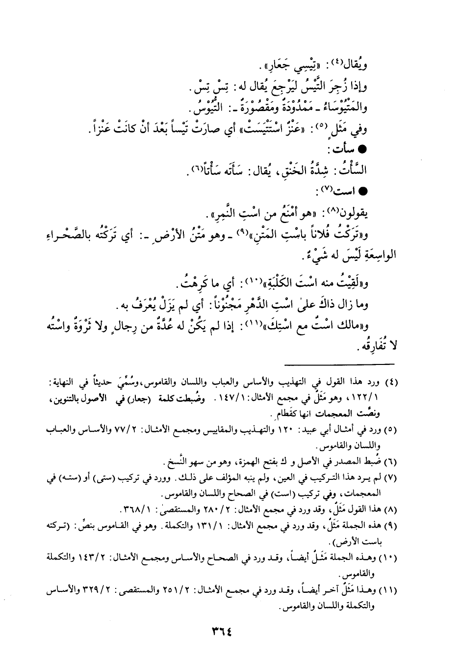وُيقال : ' تِيْسِي جَعَارِ ' . وإذا زُجِرَ التَّيْسُ ليَرْجِعَ يُقال له : تِسْ تِسْ . والمَتْيُوْسَاءُ - مَمْدُوْدَة ومَقْصُوْرَةٌ - : التُّيُوْسُ . وفي مَثَلٍ : ' عَنْزٌ اسْتَتْيَسَتْ ' أي صارَتْ تَيْساً بَعْدَ أنْ كانَتْ عَنْزاً . سأت السَّأْتُ : شِدةُ الخَنْقِ ، يُقال : سَأَتَه سَأْتاً . است يقولون : ' هو أمْنَعُ من است النَمِرِ ' . و ' تَرَكْتُ فُلاناً باست المَتْنِ ' - وهو مَتْنُ الأرْضِ - : أي تَرَكْتُه بالصَّحْراءِ الواسِعَةِ لَيْسَ له شَيْءٌ . و ' لَقِيْتُ منه است الكَلْبَةِ ' : أي ما كَرِهْتُ . وما زال ذاكَ على است الدَّهْرِ مَجْنُوْناً : أي لم يَزَلْ يُعرَفُ به . و ' مالك است مع اسْتِكَ ' : إذا لم يَكُنْ له عُدَّةٌ من رِجالٍ ولا ثَرْوَة واسْتُه لا تُفَارِقُه .