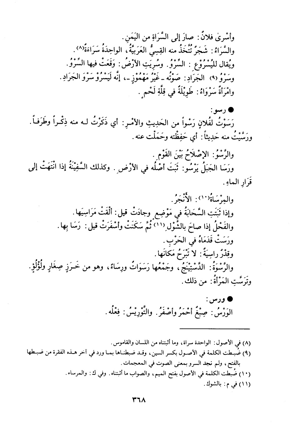 وأسْرى فلانٌ : صارَ إلى السرَاةِ من اليَمَنِ . والسَّرَاءُ : شَجَرٌ تُتخَذُ منه القِسِي العَرَبيَّةُ ، الواحِدَةُ سَرَاءةٌ . وُيقال لليُسْرُوْعِ : السرْو . وسُرِيَتِ الأرْضُ : وَقَعَتْ فيها السِّرْوُ . وسَرْوُ الجَرَادِ : صَوْتُه - غَيْرُ مَهْمُوْزٍ - ، إنَّه لَيَسْرُوْ سَرْوَ الجَرَادِ . وامْرَأةٌ سَرْوَاءُ : طَوِيْلَةٌ في قِلةِ لَحْمٍ . رسو رَسَوْتُ لفُلانٍ رَسْواً من الحَدِيثِ والأمْرِ : أي ذَكَرْتُ له منه ذِكْراً وطَرَفاً . ورَسيْتُ منه حَدِيثاً : أي حَفِظْته وحَمَلْت عنه . والرَّسْوُ : الإصْلَاحُ بَيْنَ القَوْم . ورَسَا الجَبَلُ يَرْسُو : ثَبَتَ أصلُه في الأرْضِ . وكذلك السَّفِيْنَةُ إذا انْتَهَتْ إلى قَرَارِ الماءِ . والمِرْسَاةُ : الأنْجَرُ . وإذا ثَبَتَتِ السحَابَةُ في مَوْضِعٍ وجادَتْ قيل : ألْقَتْ مَرَاسِيَها . والفَحْلُ إذا صاحَ بالشَّوْلِ ثُم سَكَنَتْ وأسْفَرَتْ قيل : رَسَا بِها . ورَسَتْ قَدَمَاهُ في الحَرْبِ . وقِدْرٌ راسِيَةٌ : لا تَبْرَحُ مَكانَها . والرسْوة : الدسْتِيْنَجُ ، وجَمعها رَسَوَاتٌ ورِسَاء ، وهو من خَرَزٍ صِغَارٍ ولُؤْلُؤٍ . وتَرَست المَرْأةُ : من ذلك . ورس الوَرْسُ : صبْغَ أحْمَرُ وأصْفَرُ . والتَّوْرِيْسُ : فِعْلُه .