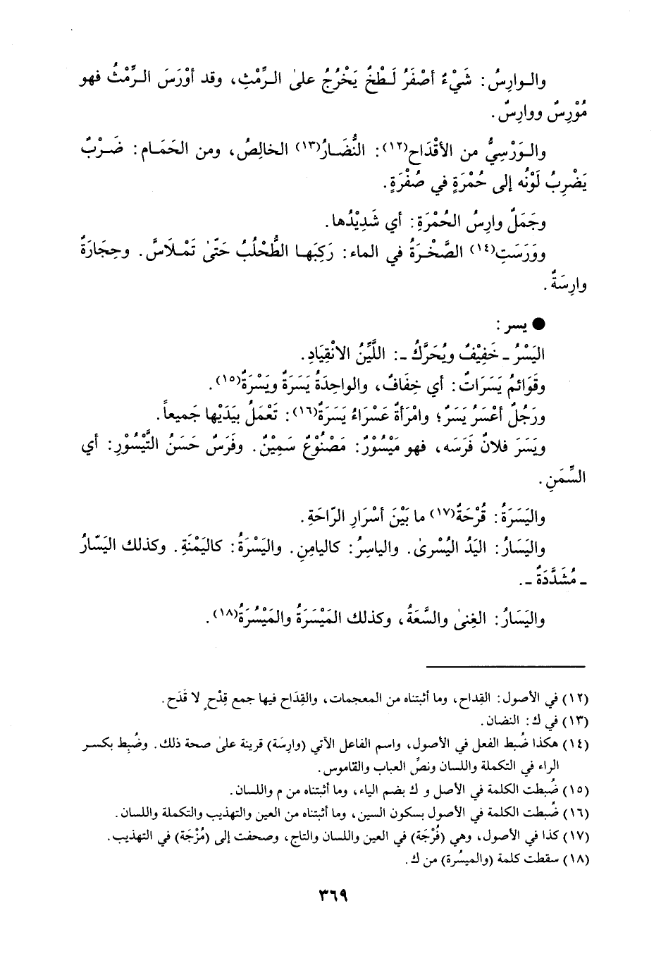 والوارِسُ : شَيْء أصْفَرُ لَطْخٌ يَخْرُجُ على الرِّمْثِ ، وقد أوْرَسَ الرِّمْثُ فهو مُوْرِسٌ ووارِسٌ . والوَرْسِي من الأقْدَاح : النُّضَارُ الخالِصُ ، ومن الحَمَام : ضَرْبٌ يَضْرِبُ لَوْنُه إلى حُمْرَةٍ في صُفرَةٍ . وجَمَل وارِسُ الخمْرَةِ : أي شَدِيْدُها . ووَرَفَ الصَّخْرَةُ في الماء : رَكِبَها الطحْلُبُ حَتّى تَمْلَاسَّ . وحِجَارَةٌ وارِسَةٌ . يسر اليَسْرُ - خَفِيْفٌ وُيحَرَّكُ - : اللَّينُ الانْقِيَادِ . وقَوَائمُ يَسَرَاتٌ : أي خِفَافٌ ، والواحِدَةُ يَسَرة ويَسْرة . ورَجُلٌ أعْسَر يَسَر ؛ وامْرَأةٌ عَسْرَاءُ يَسَرة : تَعْمَلُ بيَدَيْها جَميعاً . ويَسَرَ فلان فَرَسَه ، فهو مَيْسُوْرٌ : مَصْنُوْعٌ سَمِيْنٌ . وفَرَسٌ حَسَنُ التيْسُوْرِ : أي السمَنِ . واليَسَرَةُ : قُرْحَةٌ ما بَيْنَ أسْرَارِ الرّاحَةِ . واليَسَارُ : اليَدُ اليُسْرى . والياسِرُ : كاليامِنِ . واليَسْرَةُ : كاليَمْنَةِ . وكذلك اليَسارُ - مُشَددَة - . واليَسَارُ : الغِنى والسَّعَةُ ، وكذلك المَيْسَرَةُ والمَيْسُرَةُ .