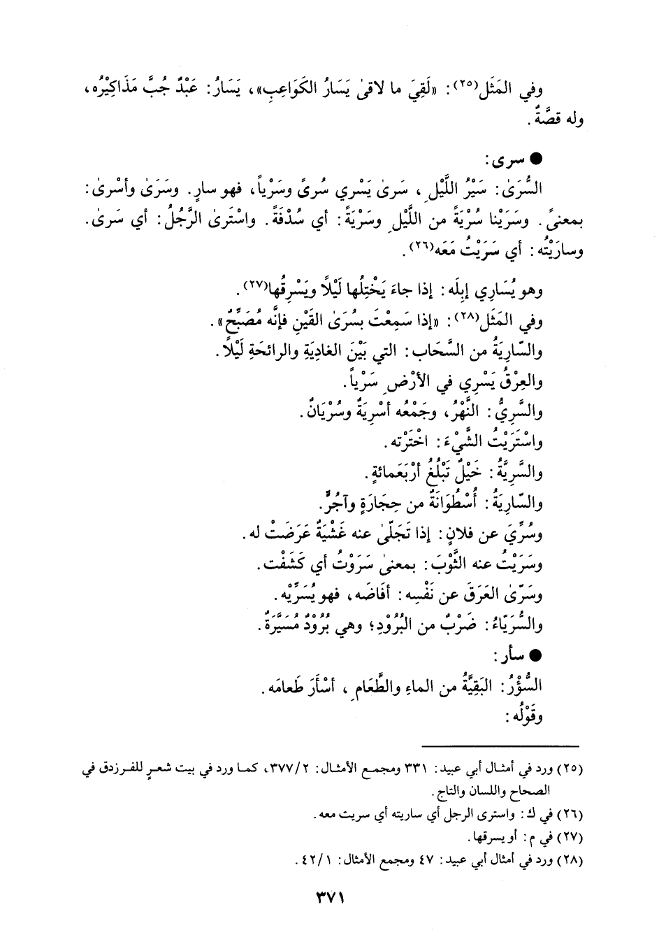 وفي المَثَل : ' لَقِيَ ما لاقى يَسَارُ الكَوَاعِبِ ' ، يَسَارُ : عَبْدٌ جُبَّ مَذَاكِيْرُه ، وله قصةٌ . سرى السرَى : سَيْرُ اللَّيْلِ ، سَرى يَسْري سُرى وسَرْياً ، فهو سارٍ . وسَرَى وأسْرى : بمعنىً . وسَرَيْنا سُرْيَةً من الليْلِ وسَرْيَةً : أي سُدْفَةً . واسْتَرى الرجُلُ : أي سَرى . وسارَيْتُه : أي سَرَيْت مَعَه . وهو يُسَارِي إبِلَه : إذا جاءَ يَخْتِلُها لَيْلاً وَيسْرِقُها . وفي المَثَل : ' إذا سَمِعْتَ بسُرَى القَيْنِ فإنَّه مُصَبِّحٌ ' . والسارِيَةُ من السحَاب : التي بَيْنَ الغادِيَةِ والرائحَةِ لَيْلاً . والعِرْقُ يَسْرِي في الأرْضِ سَرْياً . والسرِيُ : النَّهْرُ ، وجَمْعُه أسْرِيَةٌ وسُرْيَانٌ . واسْتَرَيْتُ الشَّيْءَ : اخْتَرْته . والسرِيةُ : خَيْلٌ تَبْلُغُ أرْبَعَمائةٍ . والسّارِيَةُ : أُسْطُوَانَة من حِجَارَةٍ وآجُر . وسُريَ عن فلانٍ : إذا تَجَلّى عنه غَشْيَةٌ عَرَضَتْ له . وسَرَيْتُ عنه الثَّوْبَ : بمعنى سَرَوْتُ أي كَشَفْت . وسَرّى العَرَقَ عن نَفْسِه : أفَاضَه ، فهو يُسَرِّيْه . والسُّرَيّاءُ : ضَرْبٌ من البُرُوْدِ ؛ وهي بُرُوْدٌ مُسَيَّرَةٌ . سأر السؤْرُ : البَقِيَّةُ من الماءِ والطَّعَامِ ، أسْاَرَ طَعامَه . وقَوْلُه :