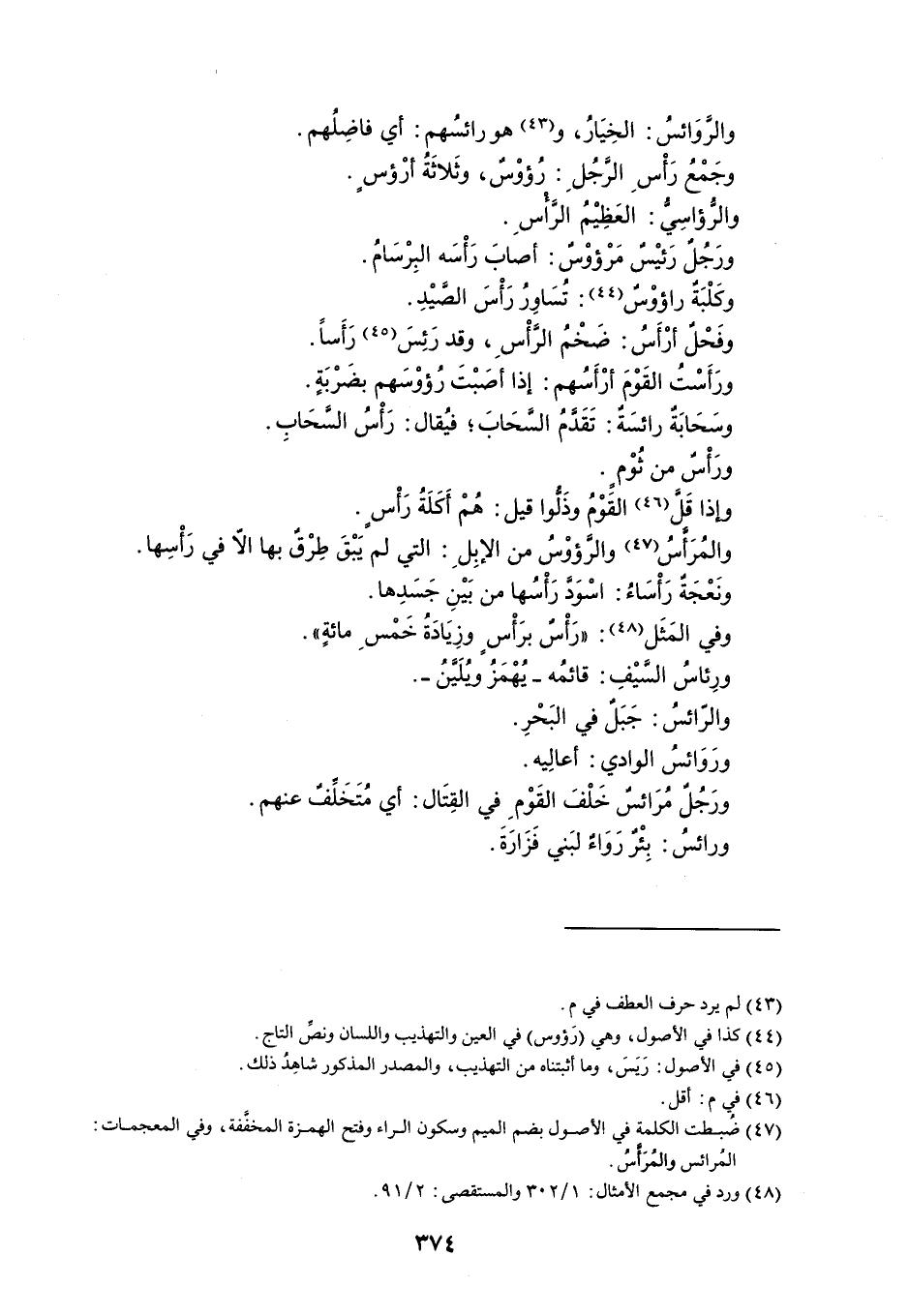 والروَائسُ : الخِيَارُ ، و هو رائسُهم : أي فاضِلُهم . وجَمْعُ رَأْسِ الرجُلِ : رُؤوْسٌ ، وثَلاثَةُ أرْؤس . والرُؤاسِيُّ : العَظِيْمُ الرأسِ . ورَجُلٌ رَئيْس مَرْؤوْس : أصابَ رَأْسَه البِرْسامُ . وكَلْبةٌ راؤوْسٌ : تُسَاوِرُ رَأْسَ الصيْدِ . وفَحْل أرْأَسُ : ضَخْمُ الرأسِ ، وقد رَئِسَ رَأَساً . ورَأَست القَوْمَ أرْأَسُهم : إذا أصَبْتَ رُؤوْسَهم بضَرْبَةٍ . وسَحَابَةٌ رائسَةٌ : تَقَدم السحَابَ ؛ فيُقال : رَأْسُ السَّحَابِ . ورَأْسٌ من ثُوْم . وإذا قَل القوْمُ وذَلُّوا قيل : هُمْ أَكَلَةُ رَأْسِ . والمُرَأَسُ والرؤوْسُ من الإبِلِ : التي لمَ يَبْقَ طِرْقٌ بها الّا في رَأْسِها . ونَعْجَةٌ رَأْسَاءُ : اسْوَد رَأْسُها من بَيْنِ جَسَدِها . وفي المَثَل : ' رَأْس برَأْسٍ وزِيَادَةُ خَمْسِ مائةٍ ' . ورِئاسُ السَّيْفِ : قائمُه - يُهْمَزُ ويلَيَّنُ - . والرائسُ : جَبَلٌ في البَحْرِ . ورَوَائسُ الوادي : أعالِيه . ورَجُلٌ مُرَائسٌ خَلْفَ القَوْمِ في القِتَال : أي مُتَخَلِّفٌ عنهم . ورائسُ : بِئْر رَوَاءٌ لبَني فَزَارَةَ .