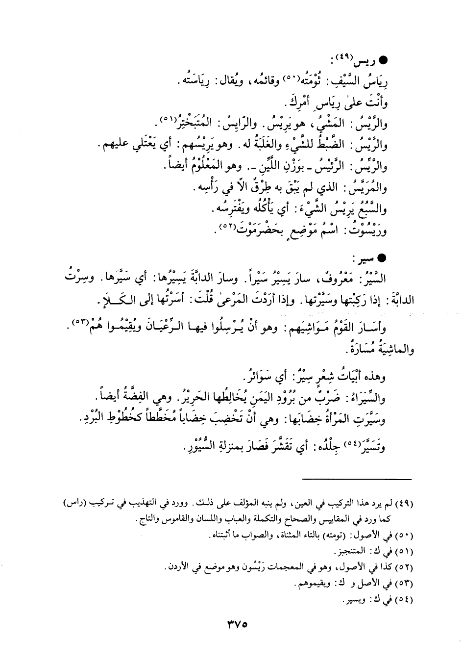 ريس رِيَاسُ السيْفِ : ثُوْمَتُه وقائمُه ، وُيقال : رِيَاسَتُه . وأنْتَ على رِيَاسِ أمْرِكَ ، والرَّيْسُ : المَشْيُ ، هو يَرِيْسُ . والرايِسُ : المُتَبَخْتِر . والرَّيْسُ : الضبْطُ للشَّيْءِ والغَلَبَةُ له . وهو يَرِيْسُهم : أي يَعْتَلي عليهم . والريِّسُ : الرئيْسُ - بوَزْنِ اللَّيِّنِ - . وهو المَعْلُوْمُ أيضاً . والمُرَيسُ : الذي لم يَبْقَ به طِرْقٌ الّا في رَأْسِه . والسَّبُعُ يَرِيْسُ الشيْءَ : أي يأكُلُه وَيفْتَرِسُه . ورَيْسُوْتُ : اسْمُ مَوْضِعٍ بحَضْرَمَوْتَ . سير السَّيْرُ : مَعْرُوفٌ ، سارَ يَسِيْرُ سَيراً . وسارَ الدابَّةَ يَسِيْرُها : أي سَيرها . وسِرْتُ الدابةَ : إذا رَكِبْتها وسَيَّرْتها . وإذا أرَدْتَ المَرْعى قُلْتَ : أسَرْتُها إلى الكَلإَ . وأسَارَ القَوْمُ مَوَاشِيَهم : وهو أنْ يُرْسِلُوا فيها الرِّعْيَانَ وُيقِيْمُوا هُمْ . والماشِيَةُ مُسَارَةٌ . وهذه أبْيَاتُ شِعْرٍ سِيْرٌ : أي سَوَائرُ . والسِّيَرَاءُ : ضَرْبٌ من بُرُوْدِ اليَمَنِ يُخَالِطُها الحَرِيْرُ . وهي الفِضَّةُ أيضاً . وسَيرَتِ المَرْأةُ خِضَابَها : وهي أنْ تَخْضِبَ خِضَاباً مُخَططاً كخُطُوْطِ البُرْدِ . وتَسَيَّرَ جِلْدُه : أي تَقَشَّرَ فَصارَ بمنزلةِ السُّيُوْرِ .