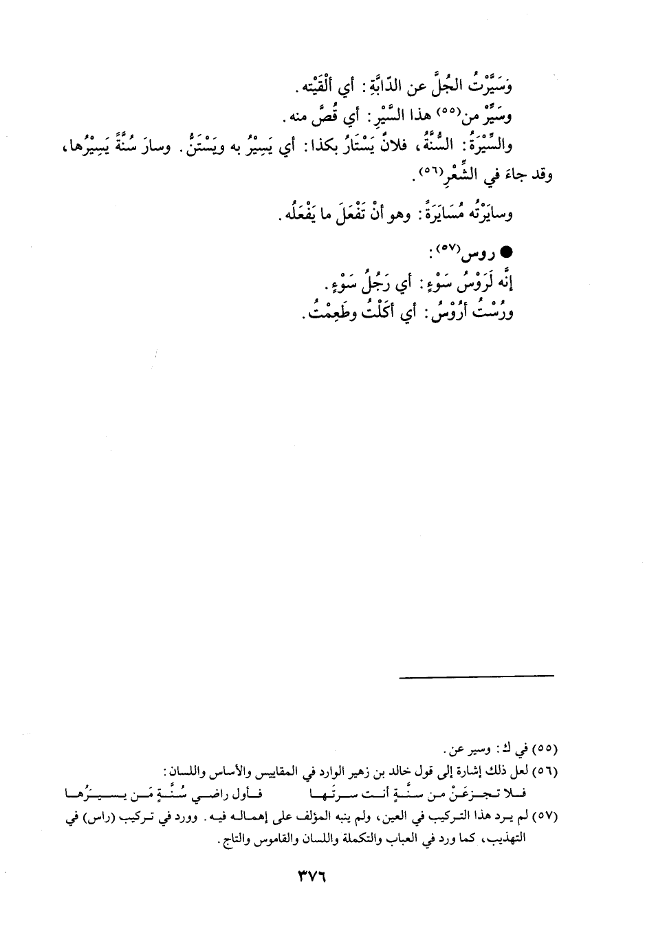 وسَيَّرْتُ الجُلَّ عن الدابَّةِ : أي ألْقَيْته . وسَيرْمن هذا السيْرِ : أي قُصَّ منه . والسيْرَةُ : السُّنَةُ ، فلانٌ يَسْتَارُ بكذا : أي يَسِيْرُ به وَيسْتَنُ . وسارَ سُنَّةً يَسِيْرُها ، وقد جاءَ في الشعْرِ . وسايَرْتُه مُسَايَرَةً : وهو أنْ تَفْعَلَ ما يَفْعَلُه . روس