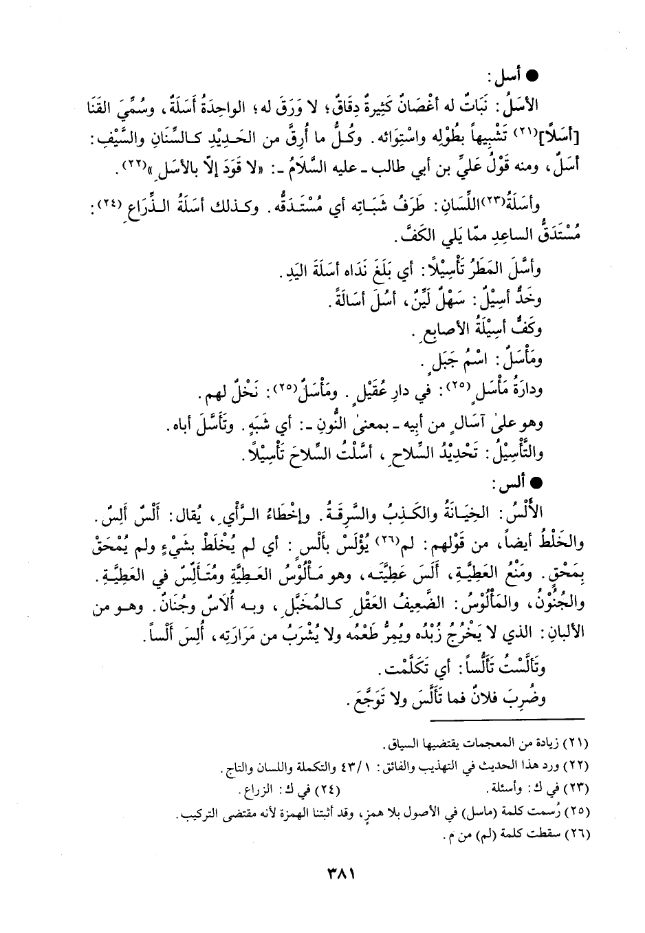 أسل الأسَلُ : نَبَاتٌ له أغْصَانٌ كَثِيرةٌ دِقَاقٌ ؛ لا وَرَقَ له ؛ الواحِدَةُ أَسَلَةٌ ، وسُمِّيَ القَنَا أسَلاً تَشْبِيهاً بطُوْلِه واسْتِوَائه . وكُلُّ ما أُرِقَّ من الحَدِيْدِ كالسِّنَانِ والسَّيْفِ : أسَلٌ ، ومنه قَوْلُ عَلي بن أبي طالب - عليه السَّلاَمُ - : ' لا قَوَدَ إلّا بالأسَلِ ' . وأسَلَةُ اللسَانِ : طَرَفُ شَبَاتِه أي مُسْتَدَقُه . وكذلك أسَلَةُ الذِّرَاع : مُسْتَدَقُ الساعِدِ ممّا يَلي الكَفَّ . وأسَّلَ المَطَرُ تَأسِيْلاً : أي بَلَغَ نَدَاه أسَلَةَ اليَدِ . وخَد أسِيْلٌ : سَهْلٌ لَينٌ ، أسُلَ أسَالَةً . وكَفٌ أسِيْلَةُ الأصابع . ومَأْسَلٌ : اسْمُ جَبَل . ودارَةُ مَأسَلٍ : في دارِعُقَيْلٍ . ومَأسَل : نَخْلٌ لهم . وهو على آسَالٍ من أبِيه - بمعنى النُّونِ - : أي شَبَهٍ . وتَأَسَّلَ أباه . والتَأْسِيْلُ : تَحْدِيْدُ السِّلاحِ ، أسَّلْتُ السِّلاح تَأْسِيْلاً . ألس الألْسُ : الخِيَانَةُ والكَذِبُ والسرِقَةُ . وإخْطَاءُ الرَّأْيِ ، يُقال : أَلْسٌ أَلِسٌ . والخَلْطُ أيضاً ، من قَوْلهم : لم يُؤْلَسْ باَلْسٍ : أي لم يُخْلَطْ بشَيْءٍ ولم يُمْحَقْ بِمَحْقٍ . ومَنْعُ العَطِيةِ ، أَلَس عَطِيَّتَه ، وهو مَأْلُوْسُ العَطِيَّةِ ومتَأَلِّس في العَطِيةِ . والجُنُوْنُ ، والمَأْلُوْسُ : الضعِيفُ العَقْلِ كالمُخَبَّلِ ، وبه أُلَاسٌ وجنَانٌ . وهو من الألبانِ : الذي لا يَخْرج زُبْدُه ويُمِرُ طَعْمُه ولا يُشْرَبُ من مَرَارَتِه ، أُلِسَ أَلْساً . وتَألسْتُ تَأَلُساً : أي تَكَلَّمْت . وضُرِبَ فلانٌ فما تَأَلَّسَ ولا تَوَجَعَ .