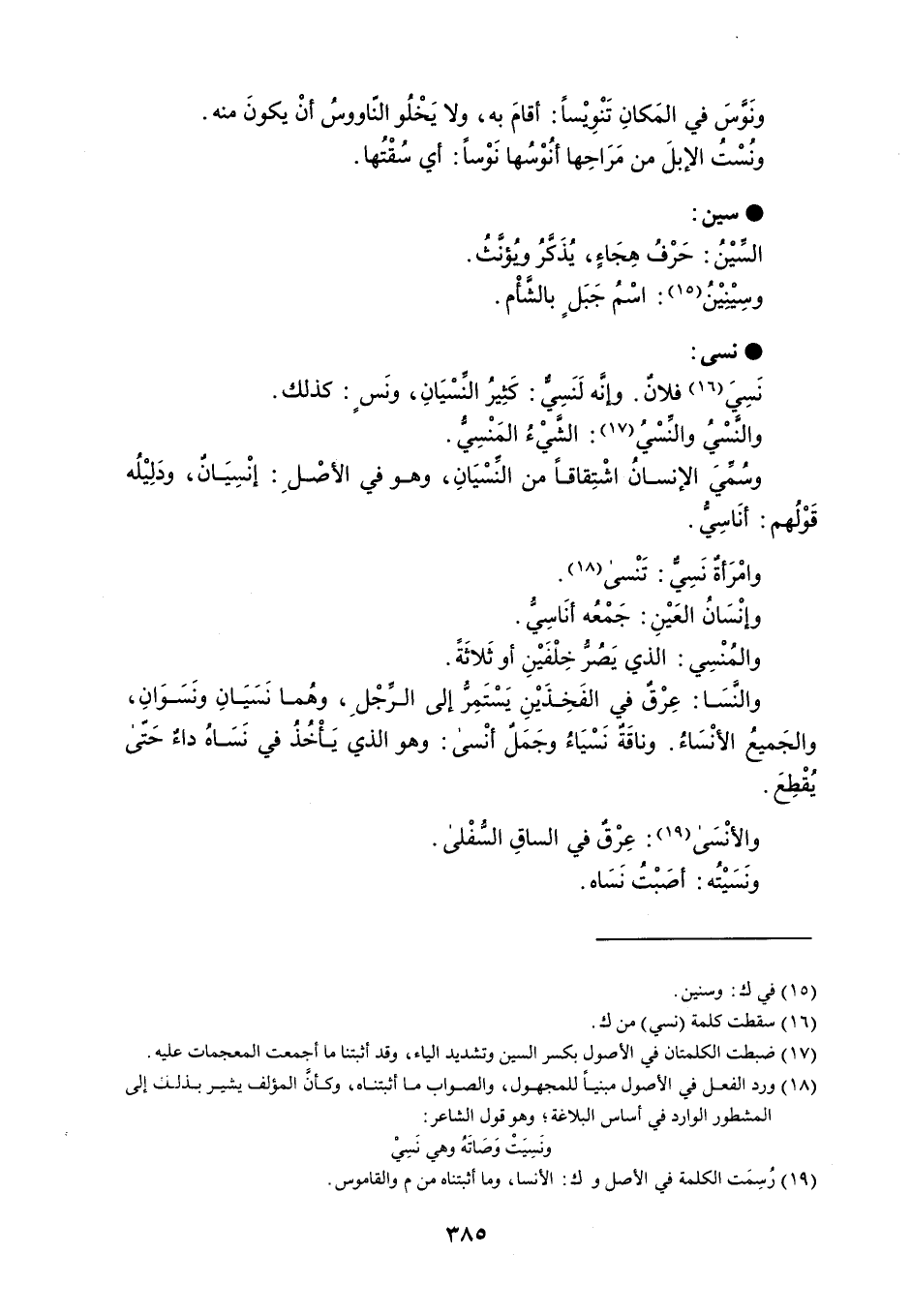 ونَوسَ في المَكانِ تَنْوِيْساً : أقامَ به ، ولا يَخْلُو النّاووسُ أنْ يكونَ منه . ونُسْتُ الإبلَ من مَرَاحِها أنُوْسُها نَوْساً : أي سُقْتُها . سين السيْنُ : حَرْفُ هِجَاءٍ ، يُذَكَّرُ وُيؤنَّثُ . وسِيْنِيْنُ : اسْمُ جَبَلٍ بالشأم . نسى نَسِيَ فلان . وإنَه لَنَسِي : كَثِيرُ النِّسْيَانِ ، ونَسٍ : كذلك . والنَسْيُ والنِّسْيُ : الشيْءُ المَنْسِي . وسُميَ الإنسانُ اشْتِقاقاً من النِّسْيَانِ ، وهو في الأصْلِ : إنْسِيَانٌ ، ودَلِيْلُه قَوْلُهم : أنَاسِيُ . وامْرَأةٌ نَسِي : تَنْسى . وإنْسَان العَيْنِ : جَمْعُه أنَاسِيُّ . والمُنْسِي : الذي يَصُرُ خِلْفَيْنِ أوثَلاثَةً . والنَّسَا : عِرْقٌ في الفَخِذَيْنِ يَسْتَمِرُّ إلى الرجْلِ ، وهُما نَسَيَانِ ونَسَوَانِ ، والجَميعُ الأنْسَاءُ . وناقَةٌ نَسْيَاءُ وجَمَلٌ أنْسى : وهو الذي يَأْخُذُ في نَسَاهُ داء حَتّى يُقْطِعَ . والأنْسَى : عِرْقٌ في الساقِ السُفْلى . ونَسَيْتُه : أصَبْتُ نَسَاه .