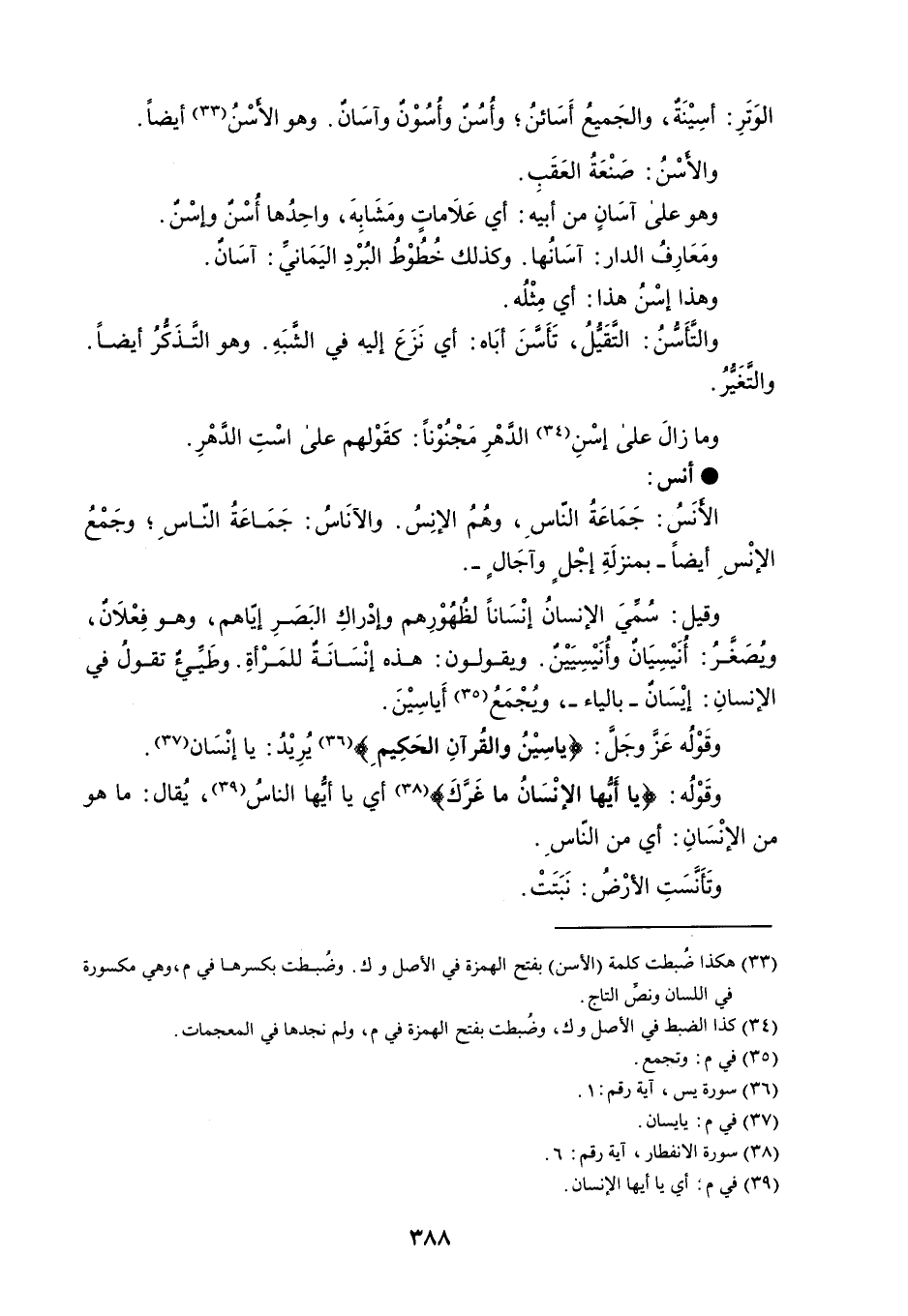 الوَتَرِ : أسِيْنَةٌ ، والجَميعُ أَسَائنُ ؛ وأُسُنٌ وأُسُوْنٌ وآسَانٌ . وهو الأسْنُ أيضاً . والأسْنُ : صَنْعَةُ العَقَب . وهو على آسَانٍ من أبيَه : أي عَلَاماتٍ ومَشَابِهَ ، واحِدُها أُسْن وإسْنٌ . ومَعَارِفُ الدار : آسَانُها . وكذلك خُطُوْطُ البُرْدِ اليَمَانيِّ : آسَانٌ . وهذا إسْنُ هذا : أي مِثْلُه . والتَأَسن : التقَيُلُ ، تَأسنَ أبَاه : أي نَزَعَ إليه في الشبَهِ . وهو التَذَكرُ أيضاً . والتَغَيُّرُ . وما زالَ على إسْنِ الدَّهْرِ مَجْنُوْناً : كقَوْلهم على است الدَّهْرِ . أنس الأنَسُ : جَمَاعَةُ النّاسِ ، وهُمُ الإنِسُ . والانَاسُ : جَمَاعَةُ النّاسِ ؛ وجَمْعُ الإنْسِ أيضاً - بمنزلَةِ إجْلٍ وآجَالٍ - . وقيل : سُميَ الإنسانُ إنْسَاناً لظُهُوْرِهم وإدْراكِ البَصَرِ إيّاهم ، وهو فِعْلاَن ، ويُصَغَرُ : أُنَيْسِيَانٌ وأنَيْسِيَيْنٌ . ويقولون : هذه إنْسَانَةٌ للمَرْأةِ . وطَيِّيءٌ تقولُ في الإنسا نِ : إيْسَانٌ - بالياء - ، ويُجْمَعُ أَياسِيْنَ . وقَوْلُه عَزَ وجَل : ' ياسِيْنُ والقُرأنِ الحَكِيمِ ' يُرِيْدُ : يا إنْسَان . وقَوْلُه : ' يا أَيُها الإنْسَانُ ما غَرَّكَ ' أي يا أيُّها الناسُ ، يُقال : ما هو من الإنْسَانِ : أي من النّاسِ . وتَأَنسَتِ الأرْضُ : نَبَتَتْ .