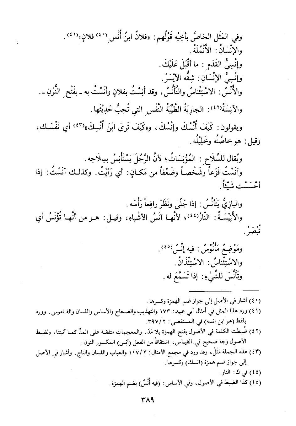 وفي المَثَل الخاص بأخِيْه قَوْلُهم : ' فلانٌ ابنُ أُنْسِ فلانٍ ' . والإنْسَانُ : الأنْمُلَةُ . إنْسِيُ القَدَمِ : ما أقْبَلَ عَلَيْكَ . وإنْسِي الإنْسَانِ : شِقُه الأيْسَرُ . والأنْسُ : الاسْتِئْناسُ والتَّأَنُسُ ، وقد أَنِسْتُ بفلانٍ وأَنَسْتُ به - بفَتْحِ النُّوْنِ - . والآنِسَةُ : الجارِيَةُ الطَّيبَةُ النَفْسِ التي تُحِب حَدِيْثَها . ويقولون : كَيْفَ أُنْسُكَ وإنْسُكَ ، و ' كَيْفَ تَرى ابْنَ أُنْسِكَ ' أي نَفْسَك ، وقيل : هو خاصتُه وخَلِيْلُه . وُيقال للسلَاحِِ : المُؤْنِسَاتُ ؛ لأنَ الرَّجُلَ يَسْتَأْنِسُ بسلَاحِه . وآنَسْتُ فَزَعاَ وشَخْصاً وضعفاً من مَكانٍ : أي رَأيْتُ . وكذلك آنَسْتُ : إذا أحْسَسْت شَيْئاً . والبازِيُ يَتَأنسُ : إذا جَلّى ونَظَرَ رافِعاً رَأْسَه . والأنِيْسَةُ : النّارُ ؛ لأنَّها آنَسُ الأشْياءِ ، وقيل : هو من أنَها تُؤْنَسُ أي تبصر . ومَوْضِعٌ مَأْنُوْسٌ : فيه إنْسٌ والاسْتِئْناسُ : الاسْتِئْذَانُ . وتَأَنَّسَ للشيْءِ : إذا تَسَمعَ له .