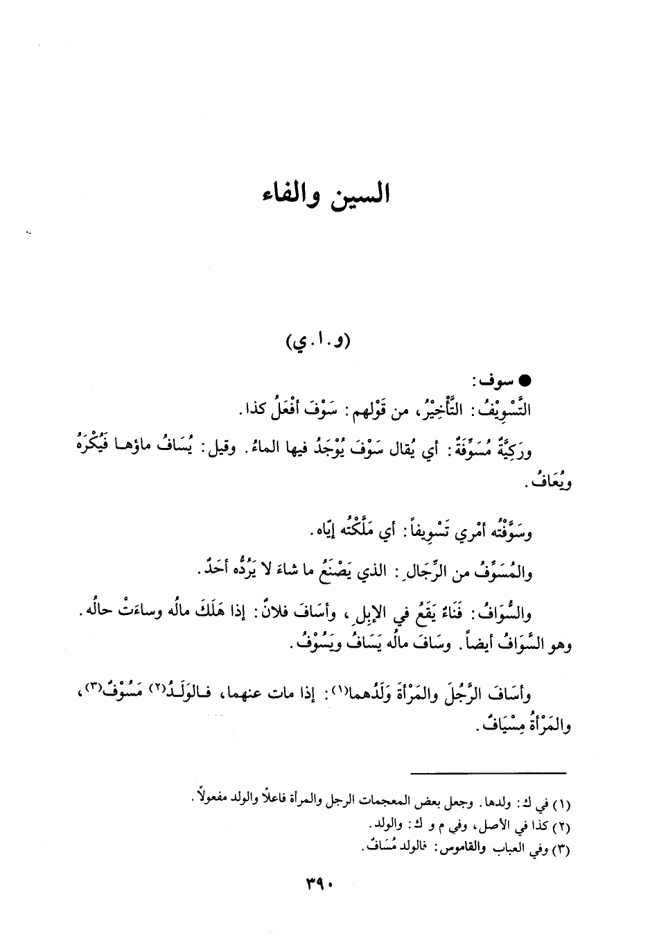 سوف التَّسْوِيْفُ : التَأْخِيْرُ ، من قَوْلهم : سَوْفَ أفْعَلُ كذا . ورَكِيةٌ مُسَوفَةٌ : أي يُقال سَوْفَ يُوْجَدُ فيها الماءُ . وقيل : يُسَافُ ماؤها فَيُكْرَهُ ويُعَافُ . وسَوفْتُه أمْري تَسْوِيفاً : أي مَلكْتُه إيّاه . والمُسَوِّفُ من الرجَالِ : الذي يَصْنَعُ ما شاءَ لا يَرُدُّه أحَدٌ . والسُوَافُ : فَنَاء يَقَعُ في الإبِلِ ، وأسَافَ فلانٌ : إذا هَلَكَ ماله وساءَتْ حالُه . وهو السَّوَافُ أيضاً . وسَافَ مالُه يَسَافُ ويَسُوْفُ . وأسَافَ الرجُلَ والمرْأةَ وَلَدُهما : إذا مات عنهما ، فالوَلَد مَسُوْف ، والمَرْأةُ مِسْيَاف .