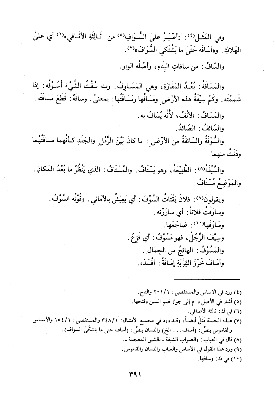 وفي المَثَل : ' أصْبَرُ على السُّوَافِ من ثَالِثَةِ الأثَافي ' أي على الهَلاكِ . و ' أسَافَه حَتى ما يَشْتَكي السوَافَ ' . والسافُ : من سافاتِ البِنَاءِ ، وأصْلُه الواو . والمَسَافَةُ : بُعْدُ المَفَازَةِ ، وهي المَسَاوِفُ . ومنه سُفْتُ الشيْءَ أَسُوْفُه : إذا شَمِمْتَه . وكَمْ سِيْفَةُ هذه الأرْضِ ومَسَافُها ومَسَافَتُها : بمعنىً . وسافَهُ : قَطَعَ مَسَافَتَه . والمَسَافُ : الأنْف ؛ لأنَه يُسَافُ به . والسّائفُ : الصّائدُ . والسُوْفَةُ والسائفَةُ من الأرْضِ : ما كانَ بَيْنَ الرَّمْلِ والجَلَدِ كأنَهما سافَتْهُما ودَنَتْ منهما . والسيفَةُ : الطَّلِيْعَةُ ، وهو يَسْتَافُ . والمُسْتَافُ : الذي يَنْظُرُ ما بُعْدُ المَكانِ . والمَوْضِعُ مُسْتَاف . ويقولونَ : فلانٌ يَقْتَاتُ السوْفَ : أي يَعِيْشُ بالأمَاني . وقُوْتُه السوْفُ . وساوَفْتُ فلاناً : أي سارَرْته . وسَاوَفَها : ضاجَعَها . وسِيْفَ الرجُلُ ، فهو مَسُوْفٌ : أي فَرخٌ . والمَسُوْفُ : الهائجُ من الجِمَالِ . وأسَافَ خَرْزَ القِرْبَةِ إسَافَةً : أفْسَدَه .
