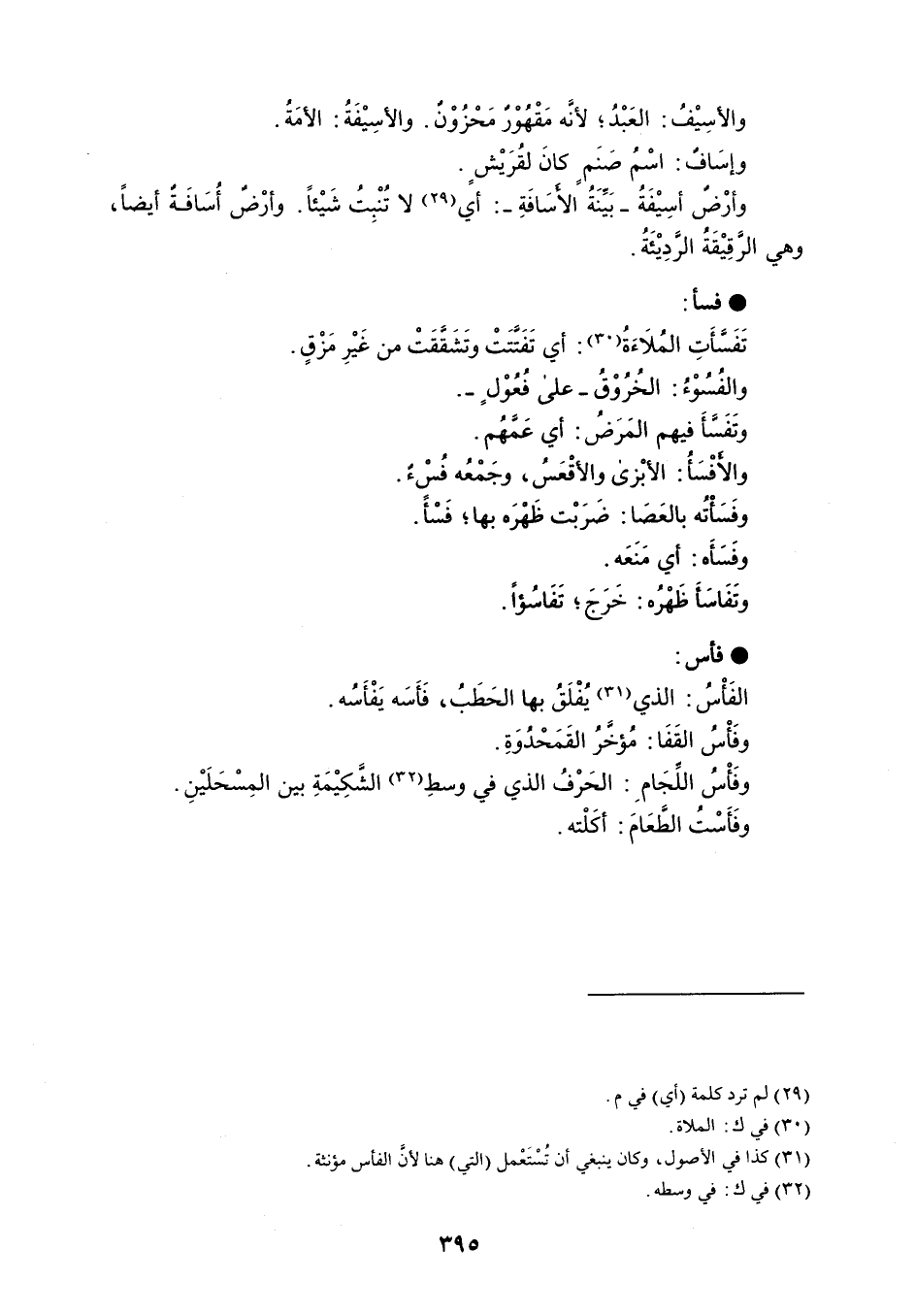 والأسِيْفُ : العَبْدُ ؛ لأنَه مَقْهُوْرٌ مَحْزُوْنٌ . والأسِيْفَةُ : الأمَةُ . وإسَافٌ : اسْمُ صَنَمٍ كانَ لقُرَيْشٍ . وأرْضٌ أسِيْفَةُ - بَينَةُ الأسَافَةِ - : أي لا تُنْبِتُ شَيْئاً . وأرْض أسَافَةٌ أيضاً ، وهي الرقِيْقَةُ الردِيْئَةُ . فسأ تَفَسأَتِ المُلَاءةُ : أي تَفَتَتَتْ وتَشَققَتْ من غَيْرِ مَزْقٍ . والفُسُوء : الخُرُوْقُ - على فُعُوْلٍ - . وتَفَسأَ فيهم المَرَضُ : أي عَمهُم . والأفْسَأ : الأبْزى والأقْعَسُ ، وجَمْعه فُسْء . وفَسَأْتُه بالعَصَا : ضَرَبْت ظَهْرَه بها ؛ فَسْأً . وفَسَأَه : أي مَنَعَه . وتَفَاسَأَ ظَهْره : خَرَجَ ؛ تَفَاسؤاً . فأس الفَأْسُ : الذي يُفْلَقُ بها الحَطَبُ ، فَأَسَه يَفْأَسُه . وفَأْسُ القَفَا : مُؤخرُ القَمَحْدُوَةِ . وفَأْسُ اللجَامِ : الحَرْفُ الذي في وسطِ الشكِيْمَةِ بين المِسْحَلَيْنِ . وفَأَست الطعَامَ : أكَلْته .