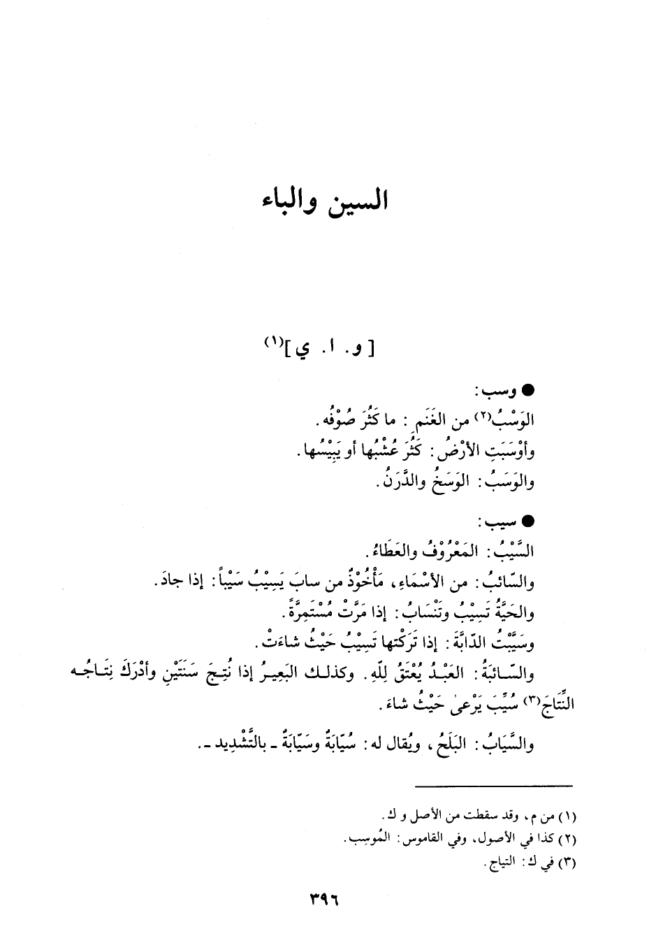 وسب الوَسب من الغَنَمِ : ما كَثُرَ صُوْفُه . وأوْسَبَتِ الأرْض : كَثُرَ عُشْبُها أو يَبِيْسُها . والوَسبُ : الوَسَخُ والدرَنُ . سيب السيْبُ : المَعْرُوْفُ والعَطَاءُ . والسائبُ : من الأسْمَاءِ ، مَأْخُوْذ من سابَ يَسِيْبُ سَيْباً : إذا جادَ . والحَيةُ تَسِيْبُ وتَنْسَابُ : إذا مَرتْ مُسْتَمِرةً . وسَيبْتُ الدابَّةَ : إذا تَرَكْتها تَسِيْبُ حَيْثُ شاءَتْ . والسائبَةُ : العَبْدُ يُعْتَقُ لِلّهِ . وكذلك البَعِيرُ إذا نُتِجَ سَنَتَيْنِ وأدْرَكَ نِتَاجُه النتَاجَ سُيبَ يرْعى حَيْثُ شاءَ . والسيَابُ : البَلَحُ ، وُيقال له : سيابَة وسَيابَة - بالتَشْدِيد - .