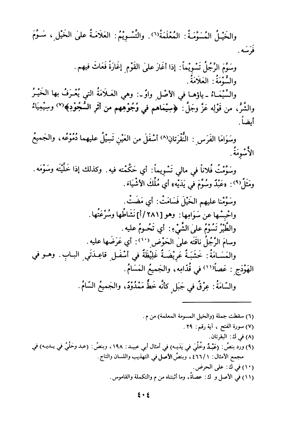 والخَيْلُ المُسَومَةُ : المُعْلَمَة . والتَسْوِيْمُ : العَلَامَة على الخَيْلِ ، سَومَ فَرَسَه . وسَومَ الرَّجُلُ تَسْوِيْماً : إذا أغَارَ على القَوْمِ إغَارَةً فَعَاثَ فيهم . والسُوْمَةُ : العَلَامَة . والسيْمَاءُ - ياؤها في الأصْلِ واوٌ - : وهي العَلَامَةُ التي يُعْرَفُ بها الخَيْرُ والشَرُّ ، من قَوْلِه عَزَ وجَل : ' سِيْمَاهم في وجوْهِهم من أثَرِ السُجُوْدِ ' وسِيْمِيَاءُ أيضاً . وسَوَامَا الفَرَسِ : النُقْرَتانِ أسْفَلَ من العَيْنِ تَسِيْلُ عليهما دُمُوْعُه ، والجَميعُ الأسْوِمَةُ . وسَوَّمْتُ فُلاناً في مالي تَسْوِيماً : أي حَكمْته فيه . وكذلك إذا خَلَّيْتَه وسَوْمَه . ومَثَل : ' عَبْد وسُومَ في يَدَيْه ' أي مُلكَ الأشْيَاءَ . وسَومْنا عليهم الخَيْلَ فَسَامَتْ : أي مَضَتْ . واحْبِسْها عن سَوَامِها : وهو نَشَاطُها وسُرْعَتُها . والطيْرُ تَسُوْمُ على الشيْءِ : أي تَحُومُ عليه . وسامَ الرجُلُ ناقَتَه على الحَوْضِ : أي عَرَضَها عليه . والمَسَامَةُ : خَشَبَةٌ عَرِيْضَةٌ غَلِيْظَةٌ في أسْفَلِ قاعِدَتَيِ البابِ . وهو في الهَوْدَجِ : عَصاً في قُدامِه ، والجَميعُ المَسَامُ . والسامَةُ : عِرْقٌ في جَبَلٍ كأنَه خَطٌ مَمْدُوْدٌ ، والجَميعُ السّامُ .