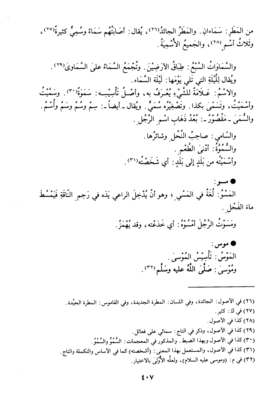 من المَطَرِ : سَمَاءانِ . والمَطَرُ الجائدُ ، يُقال : أصَابَتْهُم سَمَاءٌ وسُمِي كثيرةٌ ، وثَلاثُ أسْمٍ ، والجَميعُ الأسْمِيَةُ . والسمَاوَاتُ السبْعُ : طِبَاقُ الأرَضِيْنَ . وتُجْمَعُ السمَاءُ على السمَاوى . ويقال لِليْلَةِ التي تَلي يَوْمَها : لَيْلَة السمَاء . والاسْمُ : عَلاَمَةٌ للشيْءِ يُعْرَفُ به ، وأصْلُ تَأْسِيْسِه : سَمَوه . وسَمَّيْتُ وأسْمَيْتُ ، وتَسَمّى بكذا . وتَصْغِيْرُه سُمَيٌ . وُيقال - أيضاً - : سِمٌ وسُمٌ وسَمٌ وأُسْمٌ . والسُمَن - مَقْصُوْرٌ - : بُعْدُ ذَهَابِ اسْمِ الرجُلِ . والسامي : صاحِبُ النَّحْلِ وشائرُها . والسُمُوةُ : أدْنى الطعْمِ . وأسْمَيْتُه من بَلَدٍ إلى بَلَدٍ : أي شَخَصْتُه . مسو المَسْوُ : لُغَةٌ في المَسْيِ ؛ وهو أنْ يُدْخِلَ الراعي يَدَه في رَحِمِ الناقَةِ فَيَمْسُطَ ماءَ الفَحْلَ . ومَسَوْتُ الرجُلَ أمْسُوْهُ : أي خَدَعْته ، وقد يُهْمَزُ . موس المَوْسُ : تَأْسِيْسُ المُوْسى . ومُوْسى : صَلى اللهُ عليه وسَلم