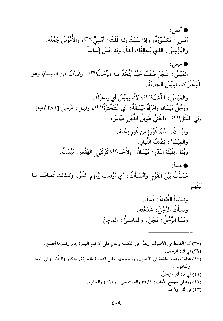 أمس أمْسِ : مَكْسُوْرَةٌ ، وإذا نَسَبْتَ إليه قُلْتَ : أَمْسِيٌّ ، والأمُوْسُ جَمْعُه . والمُؤْمِسُ : الذي يخَالِفُكَ أبداً ، وقد آمَسَ إيْمَاساً . ميس المَيْسُ : شَجَر صُلْبٌ جَيد يُتَّخَذُ منه الرحَالُ . وضَرْبٌ من المَيَسَانِ وهو التَبَخْتُرُ كما تَمِيْسُ الجارِيَةُ . والمَياسُ : الذَنَبُ ؛ لأنَه يَمِيْسُ أي يَتَحَرَّكُ . ورَجُلٌ مَيْسَان وامْرَأةٌ مَيْسَانَة : أي مُتَبَخْتِرَةٌ ، وقيل : مَيْسى . وفي المَثَل : ' الغَنيُّ طَوِيلُ الذَيْلِ مَيّاسٌ ' . ومَيْسَانُ : اسْمُ كُوْرَةٍ من كُوَرِ دِجْلَةَ . والمِيْسَاءُ : نِصْفُ النَّهارِ . وُيقال لِلَيْلَةِ البَدْرِ : مَيْسَانُ . ولأحَدِ كَوْكَبَيِ الهَقْعَةِ : مَيْسَانُ . مسأ مَسَأْتُ بَيْنَ القَوْمِ وأمْسَاْتُ : أي أوْقَعْت بَيْنَهم الشر ، وكذلك تَمَاسَأَ ما بينهم . وتَمَاسَأَ الطعَامُ : فَسَدَ . ومَسَأْتُ الرَّجُلَ : خَدَعْته . ومَسَأَ الرجُلُ : مَجَنَ ، والماسِئ : الماجِنُ .