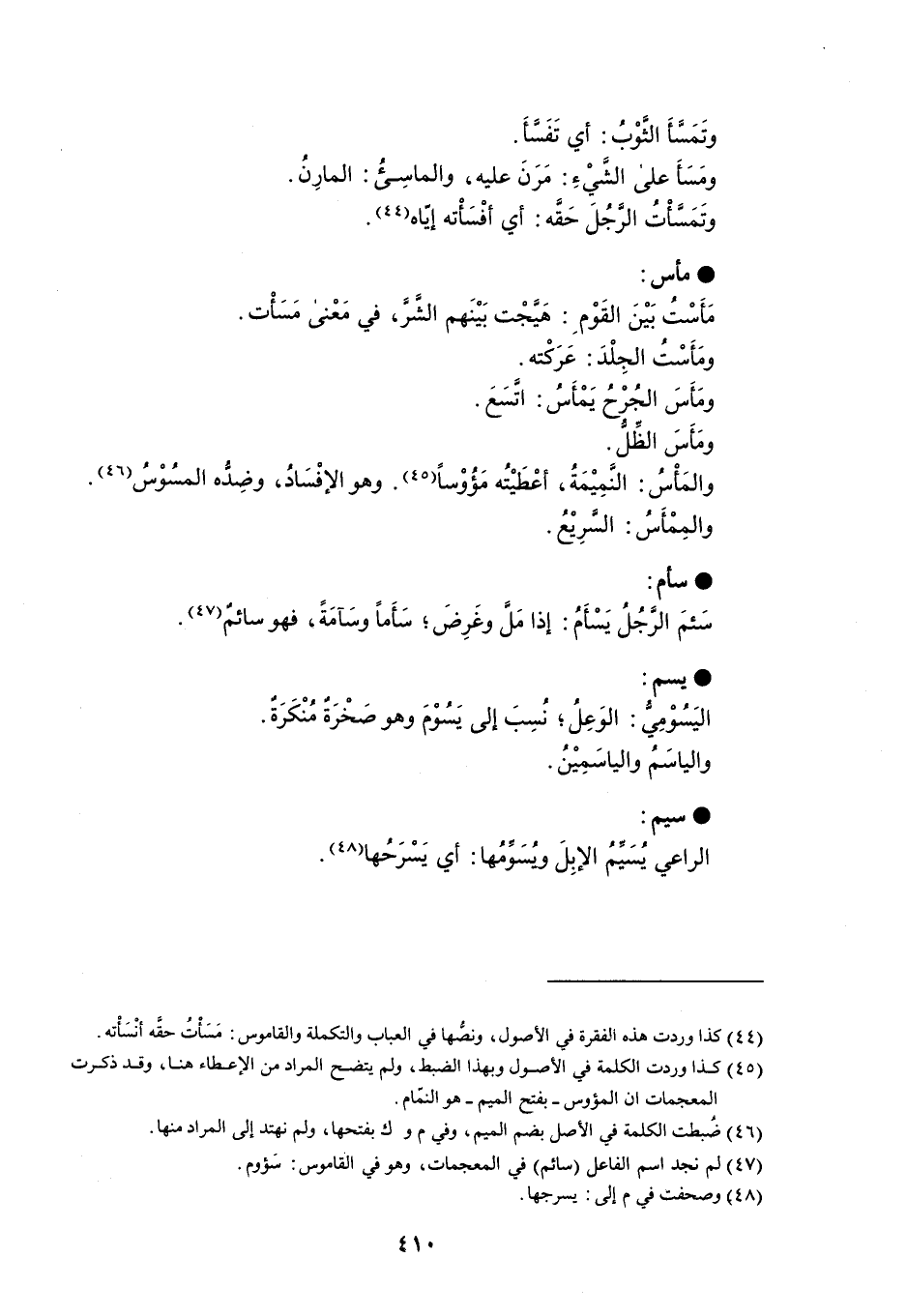 وتَمَسأَ الثوْبُ : أي تَفَسأَ . ومَسَأَ على الشَّيْءِ : مَرَنَ عليه ، والماسِئُ : المارِن . وتَمَسأْتُ الرجُلَ حَقَه : أي أفْسَاْته إيّاه . مأس مَأَف بَيْنَ القَوْمِ : هَيجْت بَيْنَهم الشَرَّ ، في مَعْنى مَسَأت . ومَأَست الجِلْدَ : عَرَكْته . ومَأَسَ الجُرْحُ يَمْأَسُ : اتَسَعَ . ومَأَسَ الظِّلّ . والمَأْسُ : النَمِيْمَةُ ، أعْطَيْتُه مَؤُوْساً . وهو الإفْسَادُ ، وضِدُه المسُوْسُ والمِمْاَسُ : السرِيْعُ . سأم سَئمَ الرجُلُ يَسْأَمُ : إذا مَل وغَرِضَ ؛ سَأَماً وسَآمَةً ، فهو سائمٌ . يسم اليَسُوْميُ : الوَعِلُ ؛ نُسِبَ إلى يَسُوْمَ وهو صَخْرَةٌ مُنْكَرَة . والياسَمُ والياسَمِيْنُ . سيم الراعي يُسَيمُ الإبِلَ وُيسَومُها : أي يَسْرَحُها .