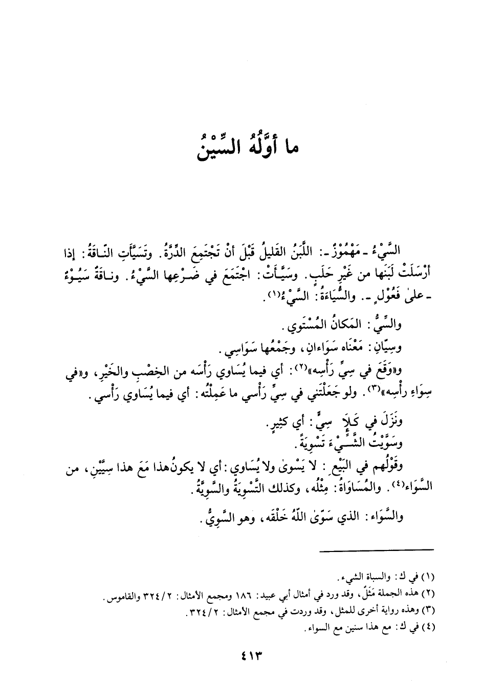 السيْءُ - مَهْمُوْز - : اللبَن القَليلُ قَبْلَ أنْ تَجْتَمِعَ الدِّرةُ . وتَسَيَّأتِ النّاقَة : إذا أرْسَلَتْ لَبَنَها من غَيْرِ حَلَب . وسَيأتْ ؛ اجْتَمَعَ في ضَرْعِها السيْءُ . وناقَةٌ سَيُوء - على فَعوْلٍ - . والسُّيَاءةُ السيْءُ . والسِّيُّ : المَكانُ المُسْتَوي . وسِيّانِ : مَعْنَاه سَوَاءانِ ، وجَمْعُها سَوَاسِي . و ' وَقَعَ في سِيِّ رَأْسِه ' : أي فيما يُسَاوي رَأْسَه من الخِصْبِ والخَيْرِ ، و ' في سِوَاءِ رأْسِه ' . ولو جَعَلْتَني في سِيِّ رَأْسي ما عَمِلْتُه : أي فيما يُسَاوي رَأْسي . ونَزَلَ في كَلإَ سِيّ : أي كثِيرٍ . وسَوَّيْتُ الشّيءَ تَسْوِيَةً . وقَوْلُهم في البَيْعِ : لا يَسْوى ولايُسَاوي : أي لا يكونُ هذا مَعَ هذا سِيَّيْنِ ، من السوَاء . والمُسَاوَاةُ : مِثْلُه ، وكذلك التسْوِيَةُ والسَّوِيَّةُ . والسَّوَاء : الذي سَوّى اللهُ خَلْقَه ، وهو السوِيُّ .