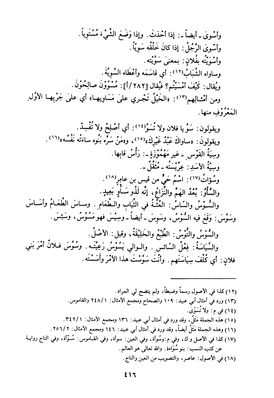وأسْوى - أيضاً - : إذا أحْدَثَ . وإذا وَضَعَ الشَيْءَ مُسْتَوِياً . وأسْوى الرجُلُ : إذا كانَ خَلْقُه سَوِيّاً . وأسْوَيْته بفُلانٍ : بمعنى سَوَّيْته . وساواه الشبَابُ : أي قاسَمَه وأعْطَاه السَّوِيَةَ . وُيقال : كَيْفَ أمْسَيْتُم ؛ فيُقال : مُسْوُوْنَ صالِحُوْنَ . ومن أمْثالِهم : ' الخَيْلُ تَجْري على مَسَاوِيها ' أي على جَرْيِها الأولِ المَعروْفِ منها . ويقولون : سَويا فلان ولا تُسَو : أي أصْلِحْ ولا تُفْسِدْ . ويقولونَ : ' ساواكَ عَبْدُ غَيْرِكَ ' ، و ' مَنْ سَره بَنُوه ساءَتْه نَفْسُه ' . وسِيَةُ القَوْسِ - غير مَهْمُوْزَةٍ - : رَأْسُ قابِها . وسِيةُ الأسَدِ : عِرِّيْسَتُه - مُثَقَل - . وسؤاتُ : اسْمُ حَف من قيس بن عامِر . والساْوُ : بُعْدُ الهَم والنزَاعُ ، إنه لَذُو سَأوٍ بَعِيدٍ . والسُوْسُ والسّاسُ : العُثَّةُ في الثِّيَابِ والطَّعَامِ . وساسَ الطَّعَامُ وأسَاسَ وسَوسَ : وَقع فيه السُّوْسُ ، وسَوِسَ - أيضاً - وسِيْسَ فهو مَسُوْسٌ ، وسَئِسَ . والسُوْسُ والتُوْسُ : الطبْعُ والخَلِيْقَةُ ، وقيل : الأصْلُ . والسيَاسَةُ : فِعْلُ السّائسِ . والوالي يَسُوْسُ رَعِيتَه . وسُوِّسَ فلانٌ أمْرَ بَني فلانٍ : أي كُلفَ سِيَاسَتَهم . وأنْتَ سَوَّست هذا الأمْرَ وأَسَسته .