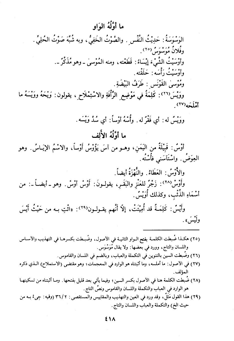 أوْسٌ : قَبِيْلَةٌ من اليَمَنِ ، وهو من آسَ يَؤوْسُ أَوْساً ، والاسْمُ الإيَاسُ . وهو العِوَضُ . واسْتَآسَني فأُسْتُه . والأوْسُ : العَطَاءُ . والنُّهْزَةُ أيضاً . وأَوس : زَجْرٌ للعَنْزِ والبَقَرِ ، يقولونَ : أَوْسْ أوْسْ . وهو - أيضاً - : من أسْمَاءِ الذَئْبِ ، وكذلك أويس . وأَيْسٌ : كَلِمَة قد أُمِيْتَتْ ، إلا أَنَّهم يقولون : ' ائْتِ به من حَيْثُ أَيْسَ ولَيْسَ ' .