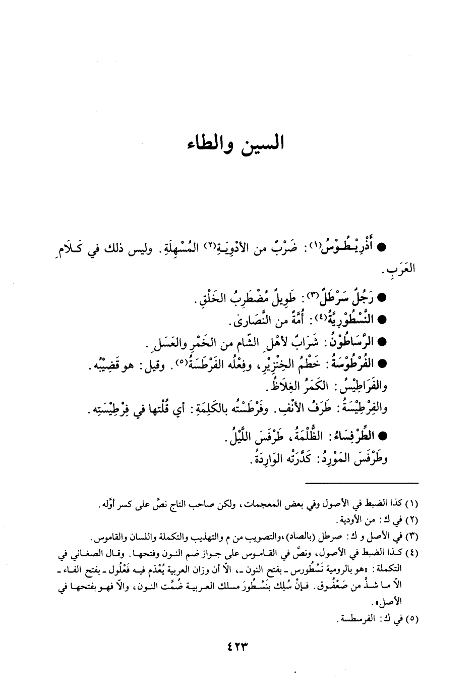 أذْرِيْطُوْسُ ضَرْبٌ من الأدْوِيَةِ المُسْهِلَةِ . وليس ذلك في كَلَامِ العَرَبِ . رَجُلٌ سَرْطَلٌ طَوِيلٌ مُضْطَرِبُ الخَلْقِ . النسْطُوْرِيَّةُ أُمَّةٌ من النَّصَارى . الرسَاطُوْنُ شَرَابٌ لأهلِ الشّام من الخَمْرِ والعَسَلِ . الفُرْطُوْسَةُ خَطْمُ الخِنْزِيْرِ ، وفِعْلُه الفَرْطَسَةُ . وقيل : هو قَضِيْبُه . والفَرَاطِيْسُ : الكَمَرُ الغِلاَظُ . والفِرْطِيْسَةُ : طَرَفُ الأنْفِ . وفَرْطَسْتُه بالكَلِمَةِ : أي قُلْتها في فِرْطِيْسَتِه . الطرْفِسَاءُ الظلْمَةُ ، طَرْفَسَ الليْلُ . وطَرْفَسَ المَوْرِدُ : كَدَّرَتْه الوَارِدَةُ .