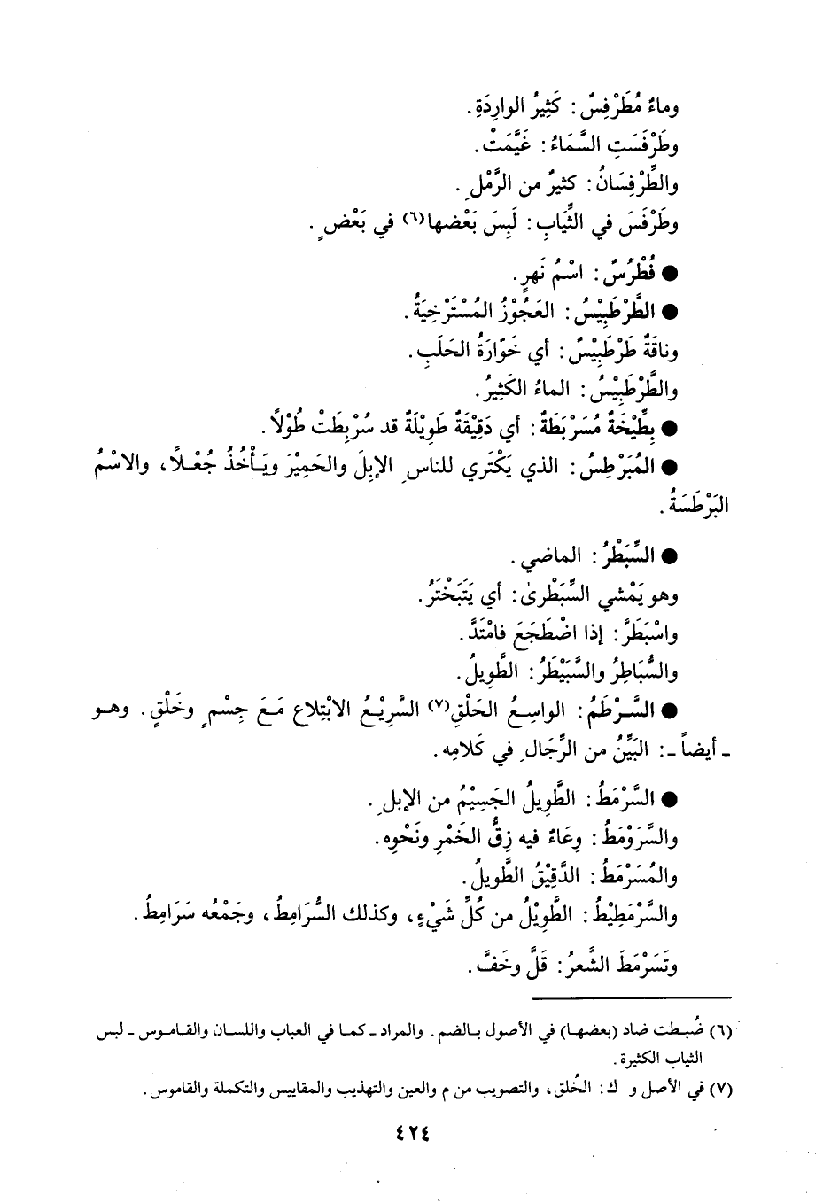 وماءٌ مُطَرْفِسٌ : كَثِيرُ الوارِدَةِ . وطَرْفَسَتِ السمَاءُ : غَيَّمَتْ . والطِّرْفِسَانُ : كثيرٌ من الرمْلِ . وطَرْفَسَ في الثِّيَابِ : لَبِسَ بَعْضها في بَعْضٍ . فُطْرُسٌ اسْمُ نَهرٍ . الطرْطَبِيْسُ العَجُوْزُ المُسْتَرْخِيَةُ . وناقَة طَرْطَبِيس : أي خَوارَةُ الحَلَبِ . والطرْطَبِيْسُ : الماءُ الكَثِيرُ . بِطيْخَة مُسَرْبَطَةٌ أي دَقِيْقَةٌ طَوِيْلَة قد سُرْبِطَتْ طُوْلاً . المُبَرْطِسُ الذي يَكْتَري للناسِ الإبِلَ والحَمِيْرَ ويَأْخُذُ جُعْلاً ، والاسْمُ البَرْطَسَةُ . السبَطْرُ الماضي . وهو يَمْشي السبَطْرى : أي يَتَبَخْتَرُ . واسْبَطَر : إذا اضْطَجَعَ فامْتَد . والسبَاطِرُ والسبَيْطَرُ : الطَّوِيلُ . السرْطَمُ الواسِعُ الحَلْقِ السَّرِيْعُ الابْتِلاع مَعَ جِسْمٍ وخَلْقٍ . وهو - أيضاً - : البَينُ من الرجَالِ في كَلامِه . السرْمَطُ الطوِيلُ الجَسِيْمُ من الإبلِ . والسرَوْمَطُ : وِعَاء فيه زِق الخَمْرِ ونَحْوِه . والمُسَرْمَطُ : الدقِيْقُ الطويلُ . والسرْمَطِيْطُ : الطوِيْلُ من كُل شَيْء ، وكذلك السرَامِطُ ، وجَمْعُه سَرَامِطُ . وتَسَرْمَطَ الشعرُ : قَلَّ وخَفَ .