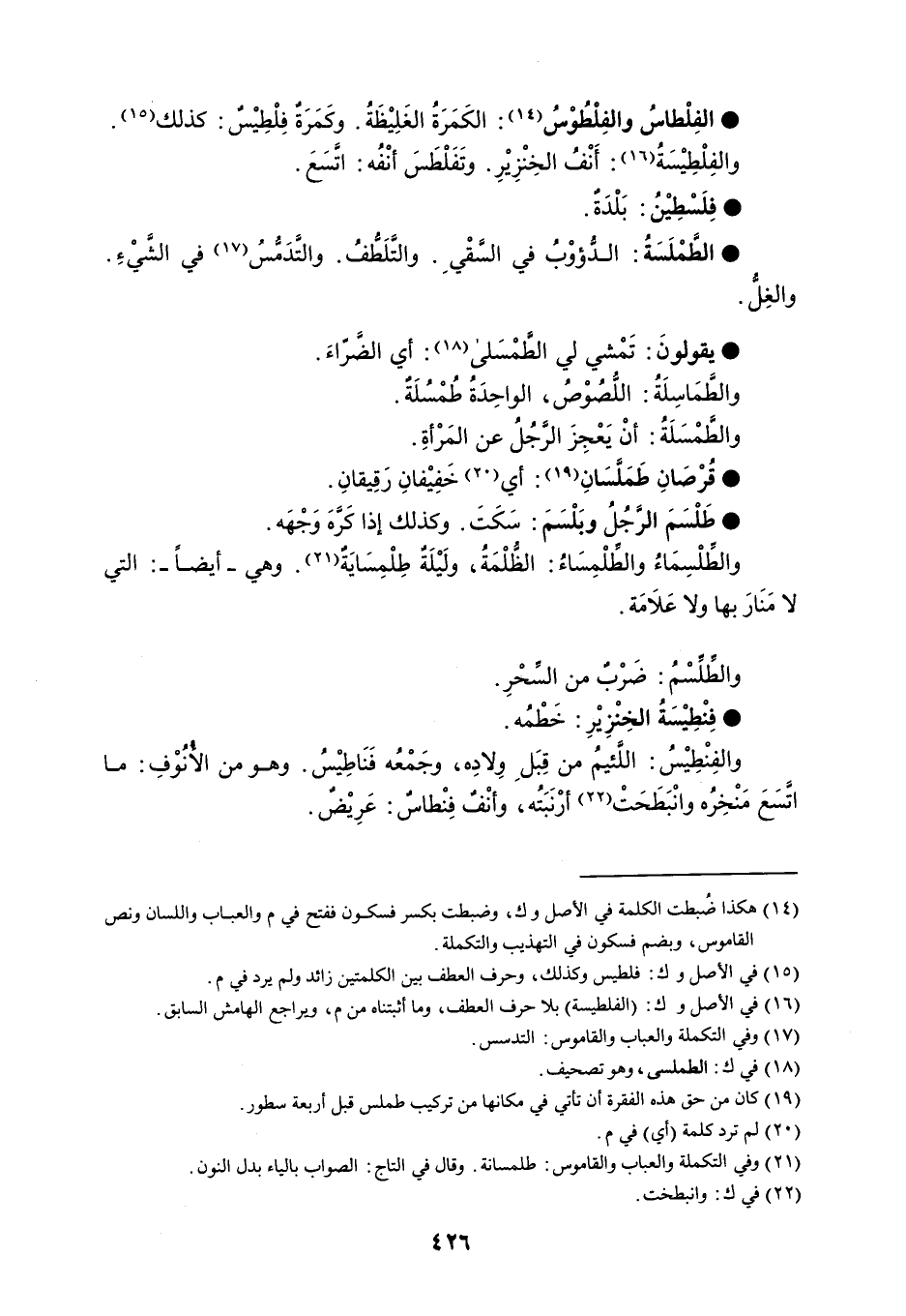الفِلْطاسُ والفِلْطُوْسُ الكَمَرَةُ الغَلِيْظَةُ . وكَمَرَةٌ فِلْطِيْسٌ : كذلك . والفِلْطِيْسَةُ : أَنْفُ الخِنْزِيْرِ . وتَفَلْطَسَ أنْفُه : اتَّسَعَ . فِلَسْطِيْنُ بَلْدَةٌ . الطمْلَسَةُ الدُّؤوْبُ في السقْيِ . والتَّلَطُفُ . والتَّدَمسُ في الشَّيْءِ . والغِلُ . يقولونَ تَمْشي لي الطَّمْسَلى : أي الضَّراءَ . والطَّمَاسِلَةُ : اللُّصُوْصُ ، الواحِدَةُ طُمْسُلَةٌ . والطمْسَلَةُ : أنْ يَعْجِزَ الرَّجُلُ عن المَرْأةِ . قُرْصَانِ طَمَلَّسَانِ أي خَفِيْفانِ رَقِيقانِ . طَلْسَمَ الرجُلُ وبَلْسَمَ سَكَتَ . وكذلك إذا كَرَّهَ وَجْهَه . والطلْسِمَاءُ والطلْمِسَاءُ : الظُّلْمَةُ ، ولَيْلَة طِلْمِسَايَةٌ . وهي - أيضاً - : التي لا مَنَارَ بها ولا عَلَامَة . والطلسْمُ : ضَرْبٌ من السحْرِ . فِنْطِيْسَةُ الخِنْزِيْرِ خَطْمُه . والفِنْطِيْسُ : اللَّئيمُ من قِبَلِ وِلادِه ، وجَمْعُه فَنَاطِيْسُ . وهو من الأنُوْفِ : ما اتَسَعَ مَنْخِرُه وانْبَطَحَتْ أرْنَبَتُه ، وأنْفٌ فِنْطاسٌ : عَرِيْضٌ .