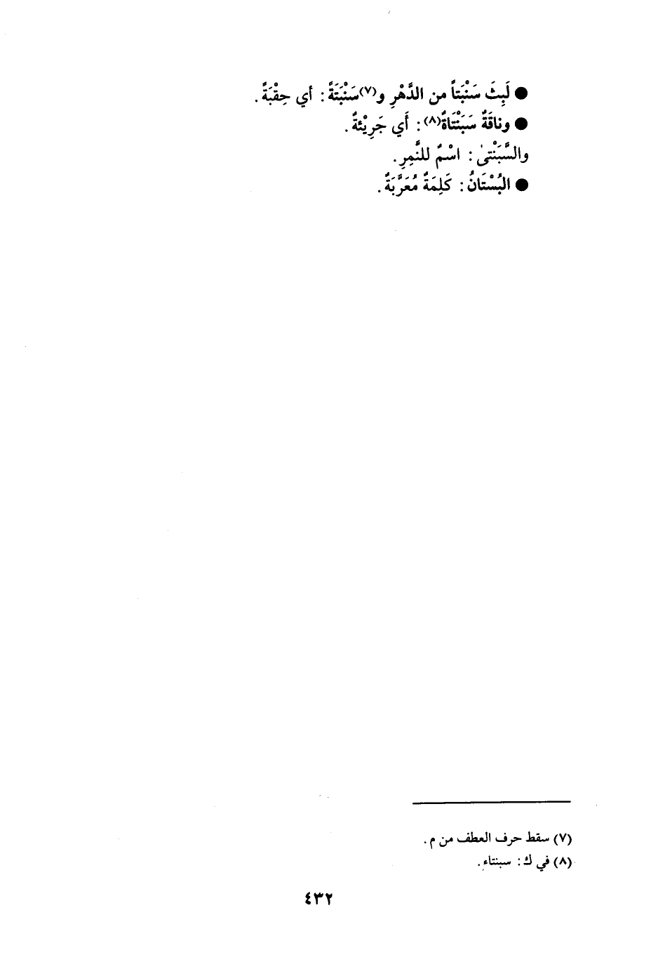 لَبِثَ سَنْبَتاً من الدهْرِ وسَنْبَتَةً أي حِقْبَةً . وناقَةٌ سَبَنْتَاة أَي جَرِيْئةٌ . والسبَنْتى : اسْمٌ للنَّمِرِ . البُسْتَانُ كَلِمَة مُعَربَةُ .