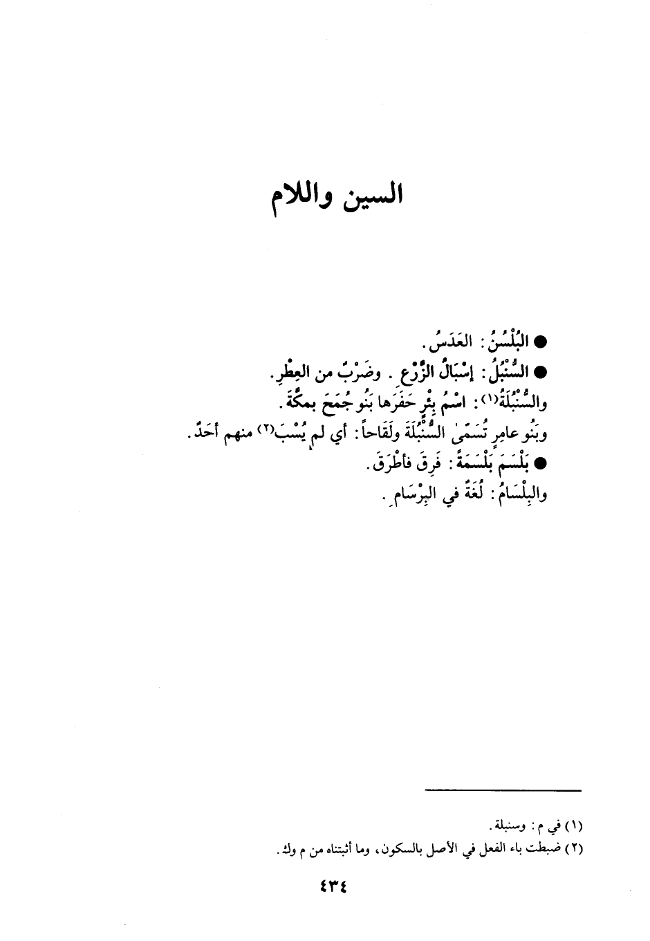 البُلْسُنُ العَدَسُ . السُّنْبُلُ اسْبَال الزرعِِ . وضَرْب من العِطرِ . والسنْبُلَة : اسْمُ بئْرٍ حَفرَها بَنُو جُمَحَ بمكةَ . وبَنُو عامِرٍ تُسَمى السنْبُلَةَ ولَقَاحاً : أي لم يُسْبَ منهم أحَدٌ . بَلْسَمَ بَلْسَمَةً فَرِقَ فأطْرَقَ . والبِلْسَامُ : لُغَة في البِرْسَامِ .