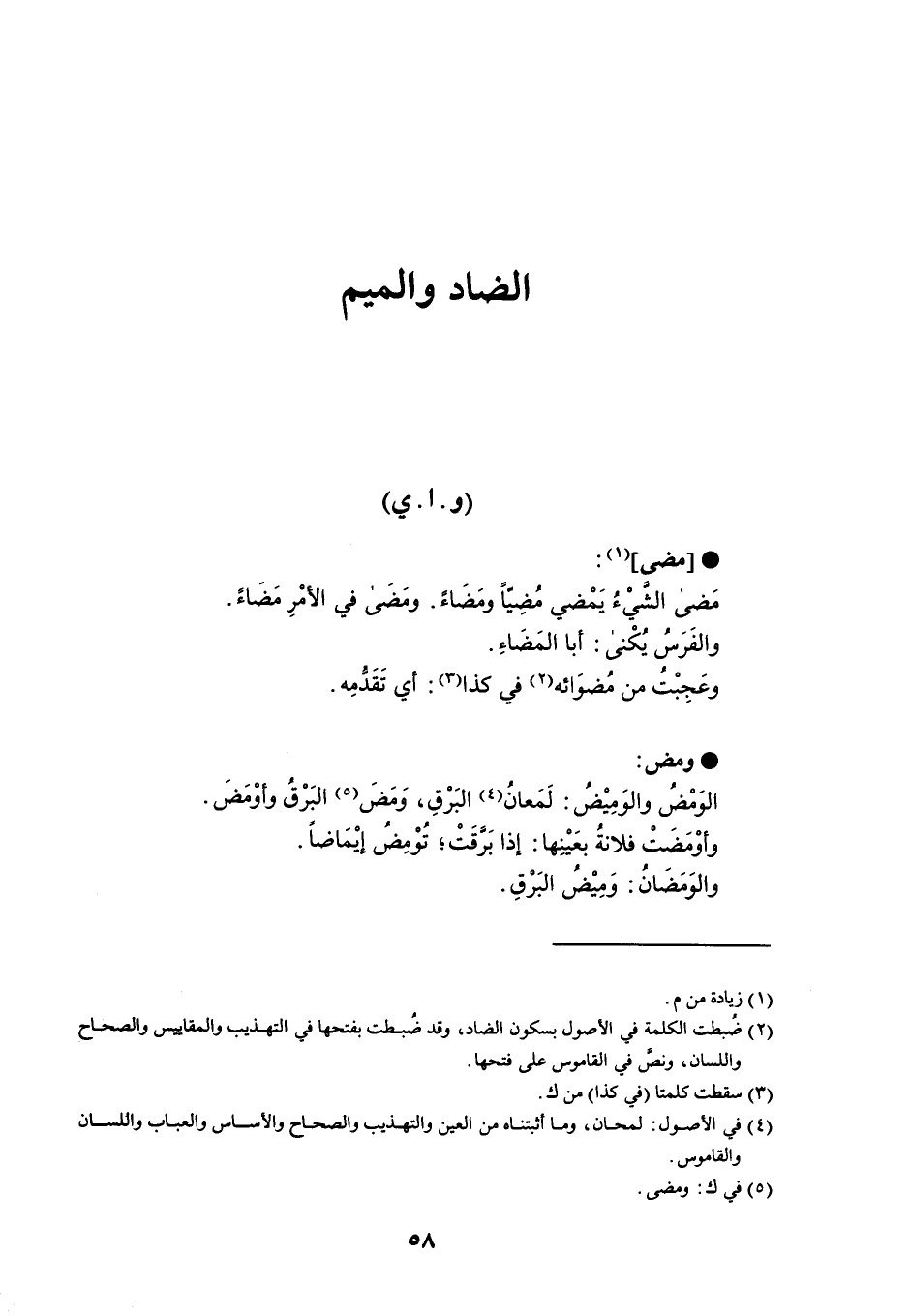 مضى مَضى الشيْءُ يَمْضي مُضِياً ومَضَاءً . ومَضَى في الأمْرِ مَضَاءً . والفَرَسُ يُكْنى : أبا المَضَاءِ . وعَجِبْتُ من مُضوَائه في كذا : أي تَقَدُّمِه . ومض الوَمْضُ والوَمِيْضُ : لَمَعانُ البَرْقِ ، وَمَضَ البَرْقُ وأوْمَضَ . وأوْمَضَتْ فلانةُ بعَيْنِها : إذا بَرقَتْ ؛ تُوْمِضُ إيْمَاضاً . والوَمَضَانُ : وَمِيْضُ البَرْقِ .