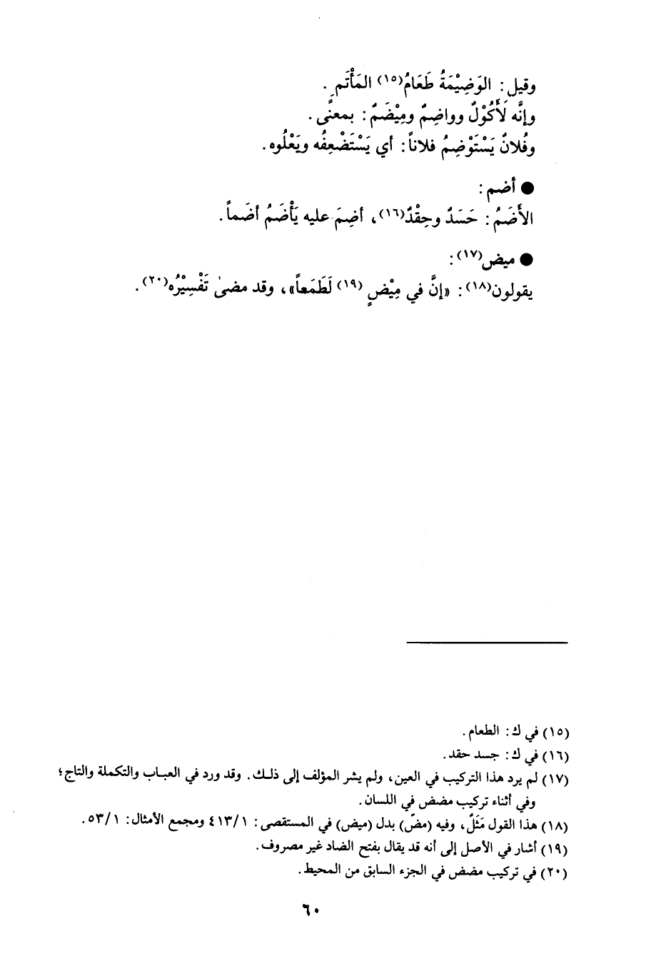 وقيل : الوَضِيْمَةُ طَعَامُ المَأتَم . وإنَّه لَأكُوْلٌ وواضِمُ ومِيْضَمٌ : بمعنى . وفُلانٌ يَسْتَوْضِم فلاناً : أي يَسْتَضْعِفه وَيعْلُوه . أضم الأضَمُ : حَسَدٌ وحِقْد ، أضِمَ عليه يَأضَمُ أضَماً . ميض يقولون : ' إنَّ في مِيْضٍ لَطَمَعاً ' ، وقد مضى تَفْسِيْرُه .