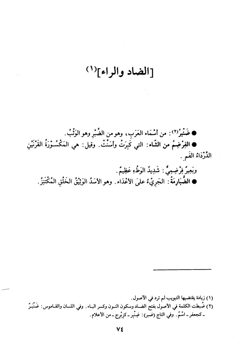 ضَنْبرُ من أسْمَاء العَرَبِ ، وهو من الضبْرِ وهو الوَثْبُ . الفِرْضِمُ من الشاء التي كَبِرَتْ وأسَنتْ . وقيل : هي المَكْسُوْرَةُ القَرْنَيْنِ الدرْدَاءُ الفَمَ . وبَعِيرٌ فِرْضِمِي : شَدِيدُ الوَطْءِ عَظِيمٌ . الضبَارِمَةُ الجَرِيْءُ على الأعْدَاء . وهو الأسَدُ الوَثِيْقُ الخَلْقِ المُكْتَنِزُ .