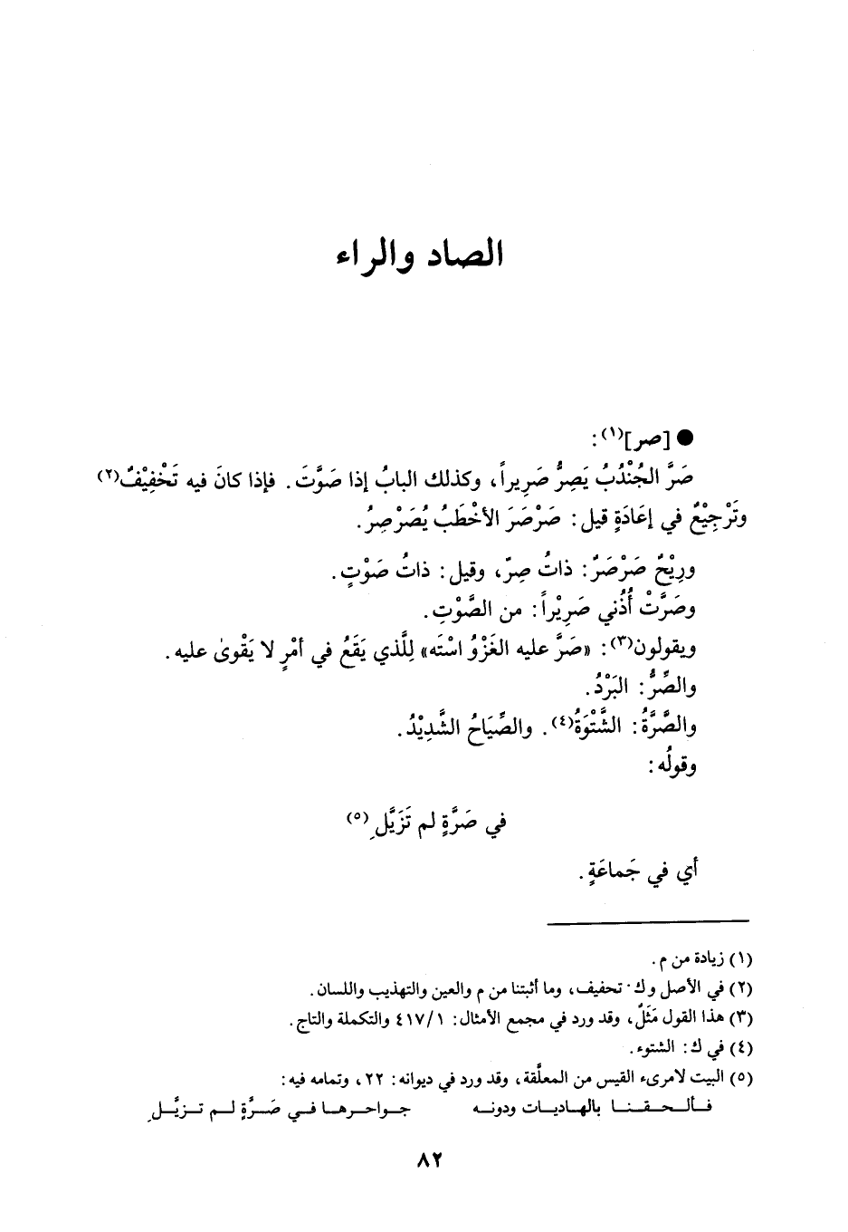 صر صَر الجُنْدُبُ يَصِرُ صَرِيراً ، وكذلك البابُ إذا صَوَّتَ . فإذا كانَ فيه تَخْفِيْفٌ وتَرْجِيْع في إعَادَةٍ قيل : صَرْصَرَ الأخْطَبُ يُصَرْصرُ . ورِيْح صَرْصَرٌ : ذاتُ صِرّ ، وقيل : ذاتُ صَوْتٍ . وصَرَتْ أُذُني صَرِيْراً : من الصَوْتِ . ويقولون : ' صَرَّ عليه الغَزْوُ اسْتَه ' لِلَذي يَقَعُ في أمْرٍ لا يَقْوى عليه . والصَر : البَرْدُ . والصَّرَّةُ : الشَّتْوَةُ . والصَيَاحُ الشدِيْدُ . وقولُه : في صَرَّةٍ لم تَزَيَّلَ أي في جَماعَةٍ .