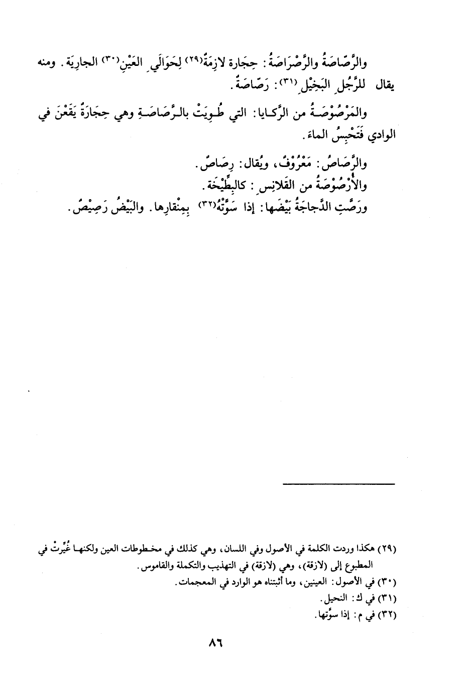 والرصاصَةُ والرصْرَاصَةُ : حِجَارة لازِمَة لِحَوَالَي العَيْنِ الجارِيَة . ومنه يقال للرجُلِ البَخِيْلِ : رَصّاصَة . والمَرْصُوْصَةُ من الركايا : التي طُوِقَيْت بالرصَاصَةِ وهي حِجَارَةٌ يَقَعْنَ في الوادي فَتَحْبِسُ الماءَ . والرصَاصُ : مَعْرُوْفٌ ، ويُقال : رِصَاصٌ . والأرْصُوْصَةُ من القَلانِسِ : كالبِطِّيْخَة . ورَصتِ الدجاجَةُ بَيْضَها : إذا سَوَّتْهُ بِمِنْقارِها . والبَيْضُ رَصِيْص .