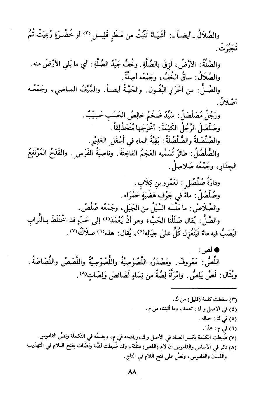 والصلاَلُ - أيضاً - : أَشْيَاءُ تَنْبُتُ من مَطَرٍ قَلِيلٍ أو خُضْرَةٍ رُعِيَتْ ثُم تجبرت . والصلةُ : الأرْضُ ، لَزِقَ بالصَّلَّةِ . وخُف جَيدُ الصلةِ : أي ما يَلي الأرْضَ منه . والصلَالُ : ساقُ الخُف ، وجَمْغه أصِلةٌ . والصل : من أحْرَارِ البُقُول . والحَيَّةُ أيضاً . والسَّيْفُ الماضي ، وجَمْعُه أصْلالٌ . ورَجُلٌ مُصَلْصَلٌ : سَيد ضَخْمٌ خالِصُ الحَسَبِ حَسِيْبٌ . وصَلْصَلَ الرجُلُ الكَلِمَةَ : أخْرَجَها مُتَحَذْلِقاً . والصَّلْصَلةُ والصُّلْصُلَةُ : بَقِيةُ الماءِ في أَسْفَلِ الغَدِيْرِ . والصُّلْصُلُ : طائر تُسَمِّيه العَجَمُ الفاخِتَةَ . وناصِيَةُ الفَرَسِ . والقَدَحُ المُرْتَفِعُ الجِدَارِ ، وجَمْعُه صَلاصِلُ . ودارَةُ صُلْصُلٍ : لعَمْرِو بنِ كِلَابٍ . وصُلْصُل : ماء في جَوْفِ هَضْبَةٍ حَمْرَاء . والصَّلَاصُ : ما مَلسَه السيْلُ من الجَبَل ، وجَمْعُه صُلْصٌ . والصَّلُّ : يُقال صَلَلْنا الحَبَّ ؛ وهو أنْ يُعْمَدَ إلى حَبٍّ قد اخْتَلَطَ بالترابِ فيُصَبَّ فيه ماءٌ فَيَنْغزِل كُل على حِيَالِه ، يُقال : هذه صلَالَته . لص اللِّص : مَعْروف . ومَصْدَرُه اللصُوْصِيةُ واللصُوْصِيةُ واللصَصُ واللصَاصَةُ . وُيقَال : لَصق يَلِصق . وامْرأةٌ لِصةٌ من نِسَاء لَصائصَ وَلصّاتٍ .