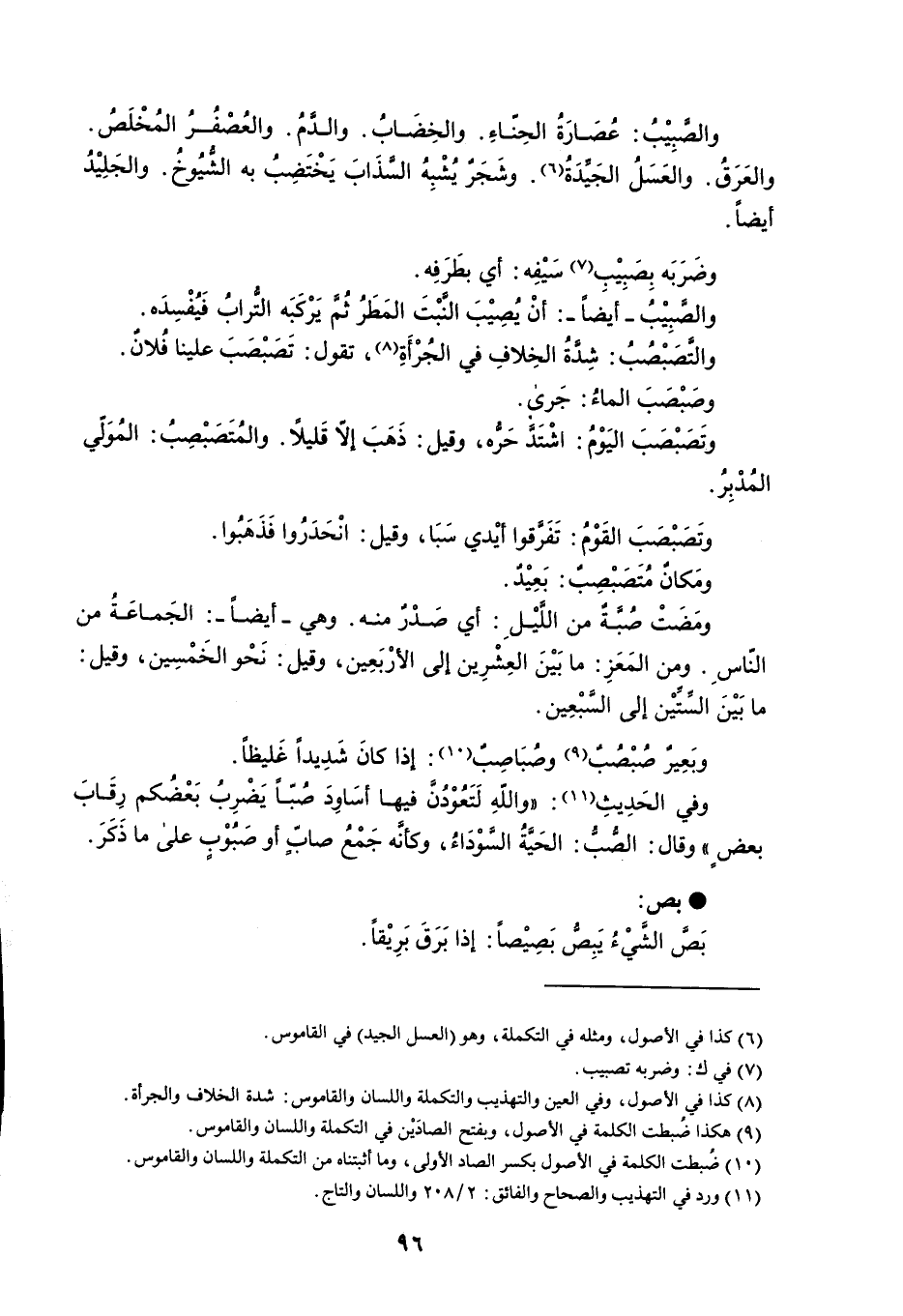 والصبِيْبُ : عُصَارَةُ الحِناءِ . والخِضَابُ . والدمُ . والعُصْفُرُ المُخْلَص . والعَرَقُ . والعَسَلُ الجَيدةَ . وشَجَرٌ يُشْبِة السذَابَ يَخْتَضِبُ به الشيُوخُ . والجَلِيْدُ أيضاً . وضَرَبَه بِصَبِيْب سَيْفِه : أي بطَرَفِه . والصبِيْبُ - أيضَاً - : أنْ يُصِيْبَ النَّبْتَ المَطَرُ ثُمَّ يَرْكَبَه الترابُ فَيُفْسِدَه . والتصَبْصُبُ : شِدَةُ الخِلافِ في الجُرْأَةِ ، تقول : تَصَبْصَبَ علينا فُلان . وصَبْصَبَ الماءُ : جَرى . وتَصَبْصَبَ اليَوْمُ : اشْتَد حَره ، وقيل : ذَهَبَ إلا قَليلاً . والمُتَصَبْصِبُ : المُوَلّي المُدْبِرُ . وتَصَبْصَبَ القَوْمُ : تَفَرقوا أيْدي سَبَا ، وقيل : انْحَدَرُوا فَذَهَبُوا . ومَكانٌ مُتَصَبْصِب : بَعِيْد . ومَضَتْ صُبةٌ من اللَيْلِ : أي صَدْر منه . وهي - أيضاً - : الجَماعَةُ من النْاسِ . ومن المَعَزِ : ما بَيْنَ العِشْرِين إلى الأرْبَعِين ، وقيل : نَحْو الخَمْسِين ، وقيل : ما بَيْنَ الستيْن إلى السبْعِين . وبَعِير صُبْصُبٌ وصُبَاصِبٌ بِز إذا كانَ شَدِيداً غَليظاً . وفي الحَدِيثِ : ' واللّهِ لَتَعُوْدُن فيها أسَاوِدَ صُبّاً يَضْرِبُ بَعْضُكم رِقَابَ بعض ' وقال : الصب : الحَيَّةُ السوْدَاءُ ، وكأنَّه جَمْعُ صابّ أو صَبُوْبٍ على ما ذَكَرَ . بص بَص الشيْءُ يَبِص بَصِيْصاً : إذا بَرَقَ بَرِيْقاً .