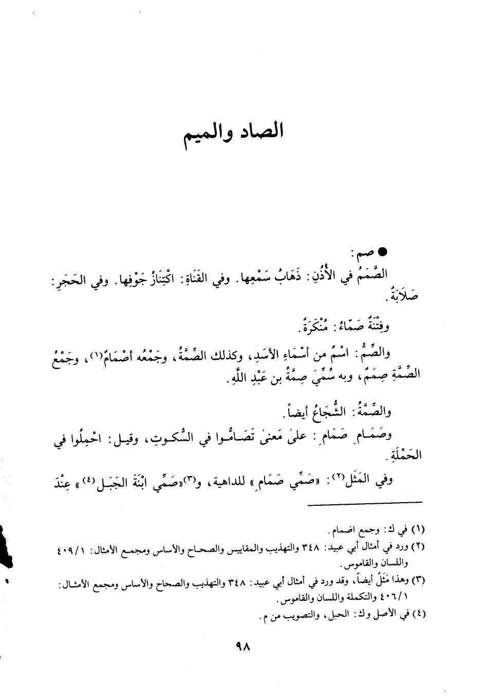 صم الصَمَمُ في الأذُنِ : ذَهَابُ سَمْعِها . وفي القَنَاةِ : اكْتِنَازُ جَوْفِها . وفي الحَجَرِ : صَلاَبَةٌ . وفِتْنَة صَمّاءُ : مُنْكَرَةٌ . والصَمُّ : اسْم من أسْمَاءِ الأسَدِ ، وكذلك الصِّمَةُ ، وجَمْعُه أصْمَامٌ ، وجَمْعُ الصَمَّةِ صِمَم ، وبه سُميَ صِمَّةُ بن عَبْدِ اللَّهِ . والصِّمَةُ : الشُّجَاعُ أيضاً . وصَمَامِ صَمَامِ : على مَعنى تَصَامّوا في السكوتِ ، وقيل : احْمِلُوا في الحَمْلَةِ . وفي المَثَل : ' صَمِّي صَمَامِ ' للداهية ، و ' صَمي ابْنَةَ الجَبَل ' عِنْدَ