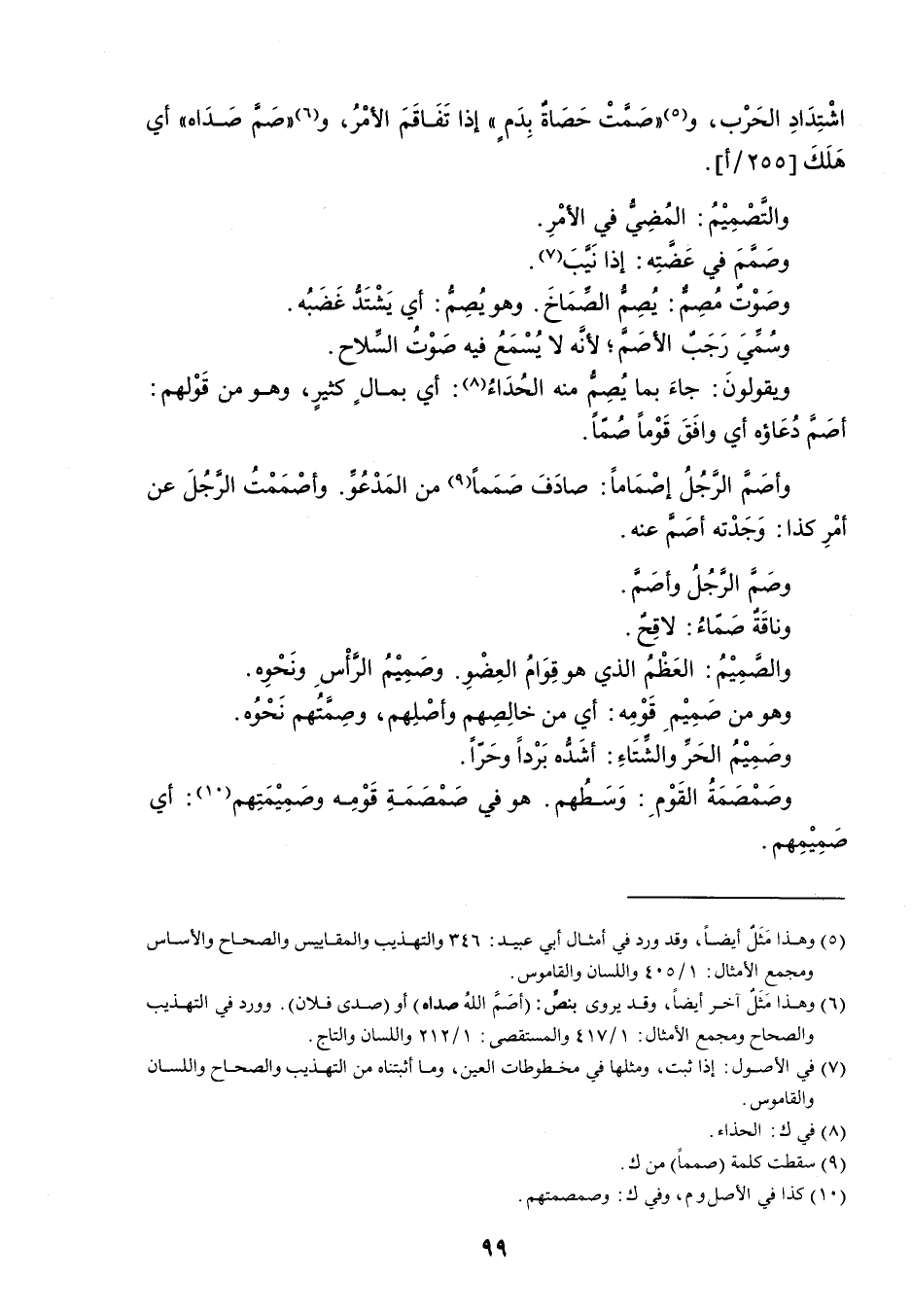 اشْتِدَادِ الحَرْب ، و ' صَمتْ حَصَاة بِدَمٍ ' إذا تَفَاقَمَ الأمْرُ ، و ' صَم صَدَاه أي هَلَكَ . والتصْمِيْمُ : المُضِيُّ في الأمْرِ . وصَممَ في عَضته : إذا نَيبَ . وصَوْت مُصم : يُصِمُّ الصمَاخَ . وهو يُصِمم : أي يَشْتَدُّ غَضَبُه . وسُميَ رَجَب الأصَم ؛ لأنَه لا يُسْمَعُ فيه صَوْتُ السلاح . ويقولونَ : جاءَ بما يُصم منه الحُدَاءُ : أي بمالٍ كثيرٍ ، وهو من قَوْلهم : أصَم دُعَاؤه أي وافَقَ قَوْماً صُماً . وأصَم الرجُلُ إصْمَاماً : صادَفَ صَمَماً من المَدْعُو . وأصْمَمْتُ الرَّجُلَ عن أمْرِ كذا : وَجَدْته أصَم عنه . وصَمم الرجُلُ وأصَمَّ . وناقَة صماءُ : لاقِحُ . والصمِيْمُ : العَظْمُ الذي هو قِوَامُ العِضْوِ . وصَمِيْمُ الرأْسِ ونَحْوِه . وهو من صَمِيْمِ قَوْمِه : أي من خالِصِهمِ وأصْلِهم ، وصِمَّتُهم نَحْوُه . وصَمِيْمُ الحَر والشتَاءِ : أشَدُّه بَرْداً وحَراً . وصَمْصَمَةُ القَوْمِ : وَسَطُهم . هو في صَمْصَمَةِ قَوْمِه وصَمِيْمَتِهم : أي صمِيمِهم .