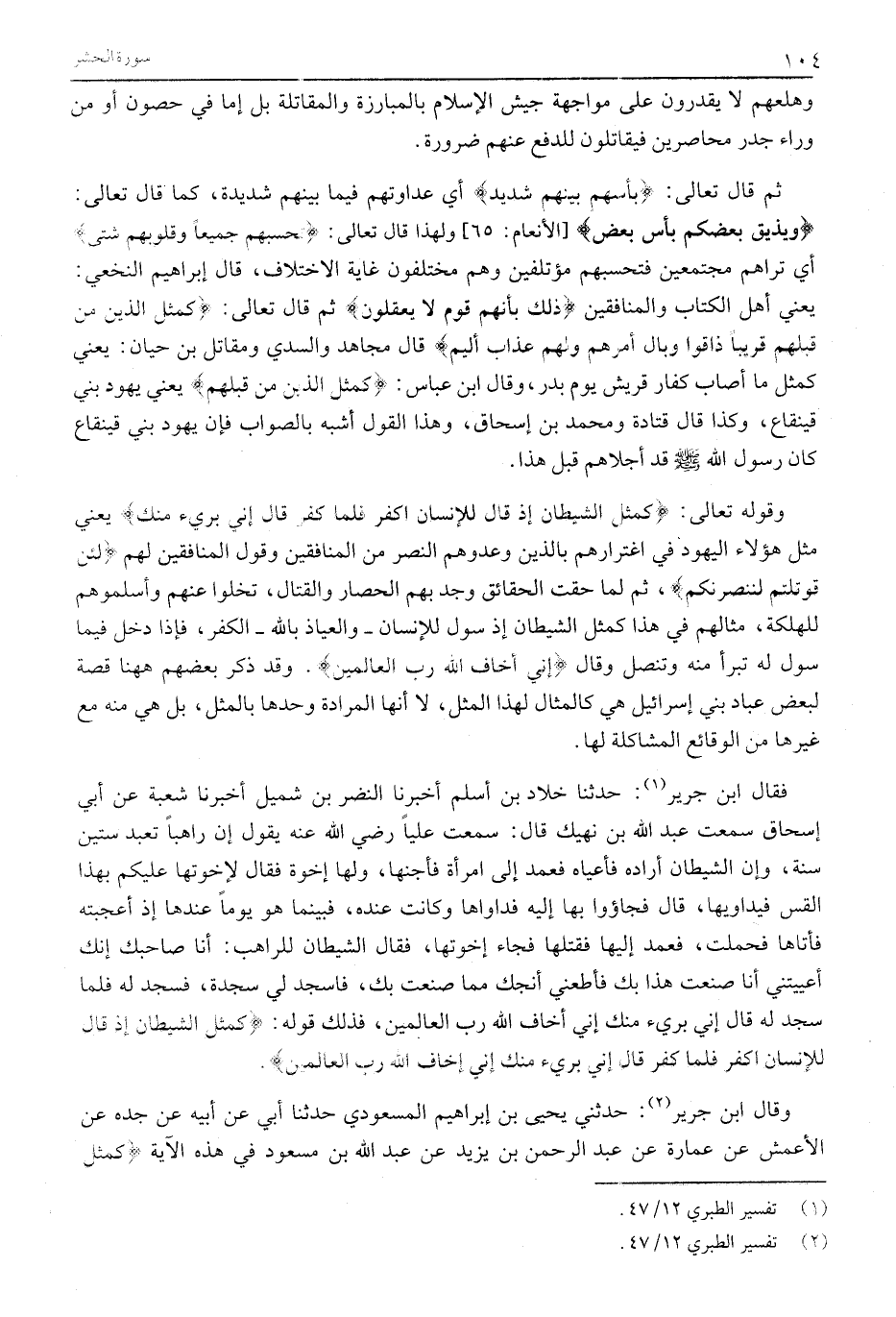وقوله تَعَالَى: كَمَثَلِ الشَّيْطانِ إِذْ قالَ لِلْإِنْسانِ اكْفُرْ فَلَمَّا كَفَرَ قالَ إِنِّي بَرِيءٌ مِنْكَ يَعْنِي مَثَلُ هَؤُلَاءِ الْيَهُودِ فِي اغْتِرَارِهِمْ بِالَّذِينِ وَعَدُوهُمُ النَّصْرَ من المنافقين وقول المنافقين لهم إِنْ قُوتِلْتُمْ لَنَنْصُرَنَّكُمْ، ثُمَّ لَمَّا حَقَّتِ الْحَقَائِقُ وَجَدَّ بِهِمُ الْحِصَارُ وَالْقِتَالُ، تَخَلَّوْا عَنْهُمْ وَأَسْلَمُوهُمْ لِلْهَلَكَةِ، مِثَالُهُمْ فِي هَذَا كَمَثَلِ الشَّيْطَانِ إِذْ سَوَّلَ لِلْإِنْسَانِ- وَالْعِيَاذُ بِاللَّهِ- الْكُفْرَ، فَإِذَا دَخَلَ فِيمَا سول له تَبَرَّأَ مِنْهُ وَتَنَصَّلَ وَقَالَ إِنِّي أَخافُ اللَّهَ رَبَّ الْعالَمِينَ. وقد ذكر بعضهم هاهنا قِصَّةً لِبَعْضِ عُبَّادِ بَنِي إِسْرَائِيلَ هِيَ كَالْمِثَالِ لِهَذَا الْمَثَلِ، لَا أَنَّهَا الْمُرَادَةُ وَحْدَهَا بِالْمَثَلِ، بَلْ هِيَ مِنْهُ مَعَ غَيْرِهَا مِنَ الْوَقَائِعِ الْمُشَاكِلَةِ لَهَا.