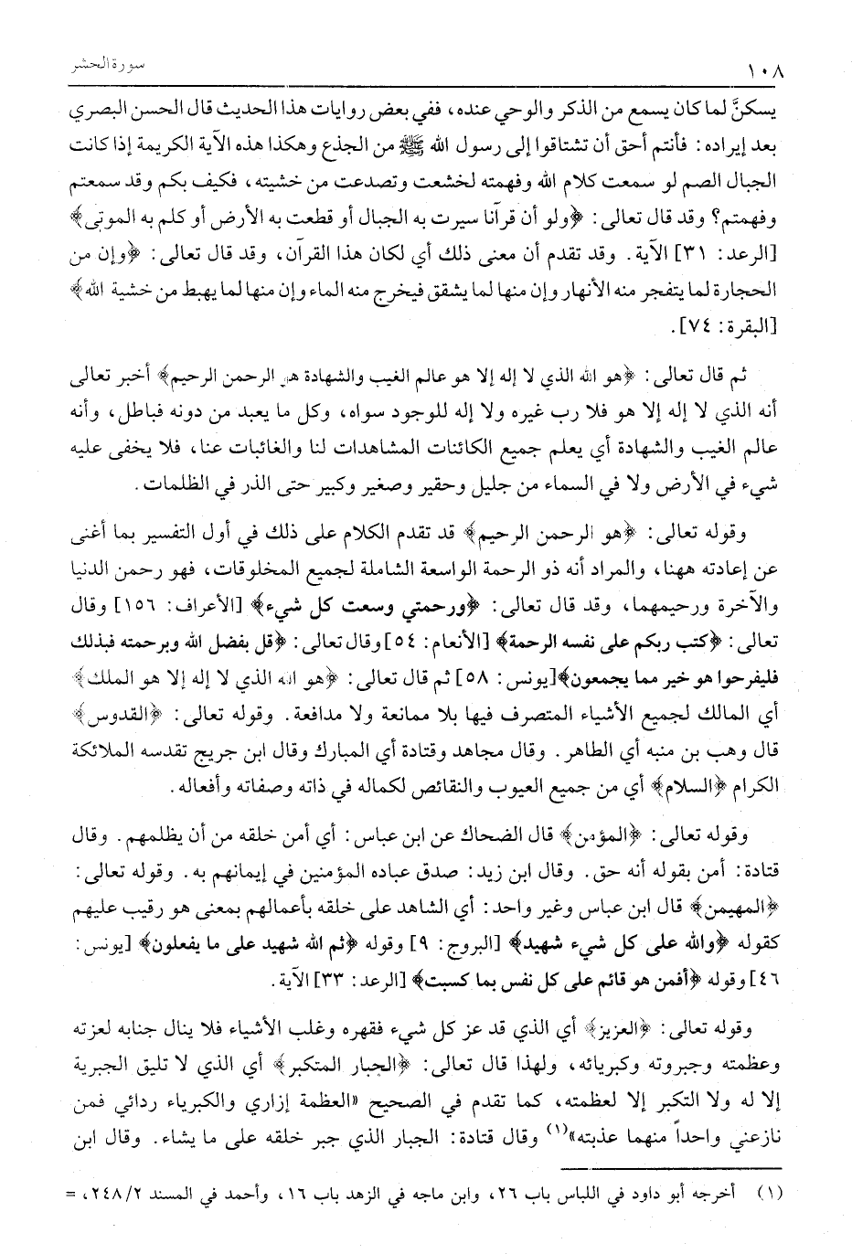 وَقَوْلُهُ تعالى: هُوَ الرَّحْمنُ الرَّحِيمُ قَدْ تَقَدَّمَ الْكَلَامُ عَلَى ذَلِكَ فِي أَوَّلِ التَّفْسِيرِ بِمَا أَغْنَى عَنْ إِعَادَتِهِ هاهنا، وَالْمُرَادُ أَنَّهُ ذُو الرَّحْمَةِ الْوَاسِعَةِ الشَّامِلَةِ لِجَمِيعِ الْمَخْلُوقَاتِ، فَهُوَ رَحْمَنُ الدُّنْيَا وَالْآخِرَةِ وَرَحِيمُهُمَا، وَقَدْ قَالَ تَعَالَى: وَرَحْمَتِي وَسِعَتْ كُلَّ شَيْءٍ [الْأَعْرَافِ: 156] وقال تَعَالَى: كَتَبَ رَبُّكُمْ عَلى نَفْسِهِ الرَّحْمَةَ [الْأَنْعَامِ: 54] وَقَالَ تَعَالَى: قُلْ بِفَضْلِ اللَّهِ وَبِرَحْمَتِهِ فَبِذلِكَ فَلْيَفْرَحُوا هُوَ خَيْرٌ مِمَّا يَجْمَعُونَ [يونس: 58] ثُمَّ قَالَ تَعَالَى: هُوَ اللَّهُ الَّذِي لَا إِلهَ إِلَّا هُوَ الْمَلِكُ أَيِ الْمَالِكُ لِجَمِيعِ الْأَشْيَاءِ الْمُتَصَرِّفُ فِيهَا بِلَا مُمَانَعَةٍ وَلَا مُدَافَعَةٍ. وقوله تعالى: الْقُدُّوسُ قَالَ وَهْبُ بْنُ مُنَبِّهٍ أَيِ الطَّاهِرُ. وَقَالَ مُجَاهِدٌ وَقَتَادَةُ أَيِ الْمُبَارَكُ وَقَالَ ابْنُ جُرَيْجٍ تُقَدِّسُهُ الْمَلَائِكَةُ الْكِرَامُ السَّلامُ أَيْ مِنْ جميع العيوب والنقائص لكماله في ذاته وصفاته وأفعاله.